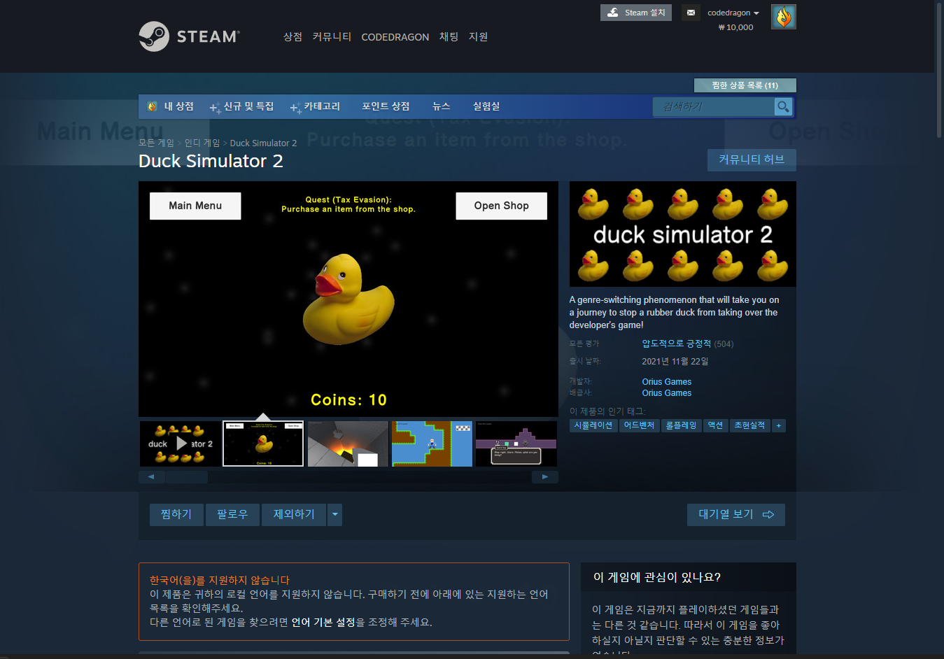 "Duck Simulator 2" 스팀 페이지 입니다.