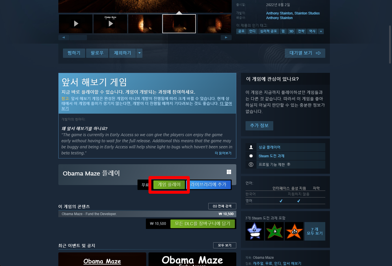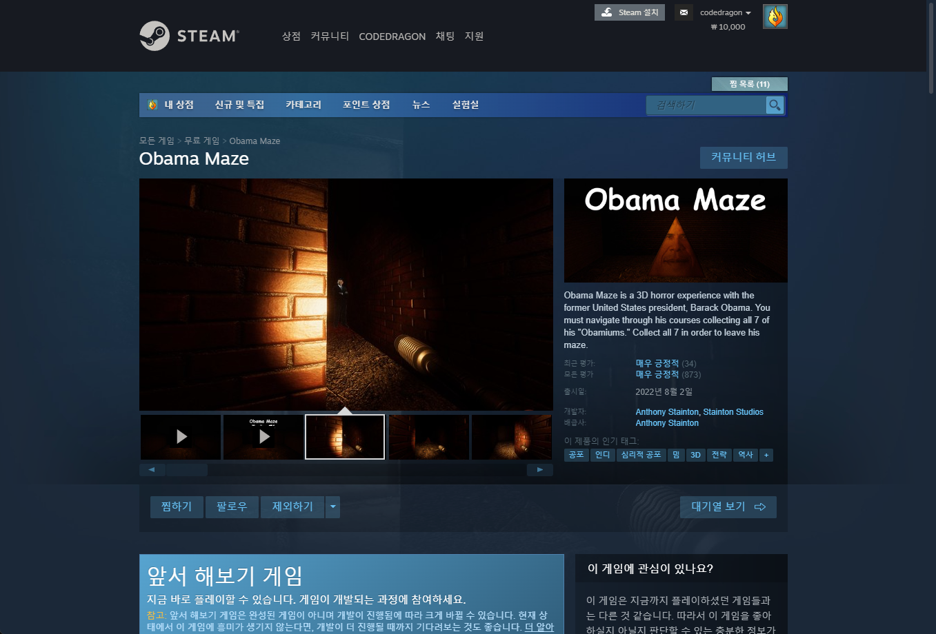 "Obama Maze" 스팀 페이지 입니다.
