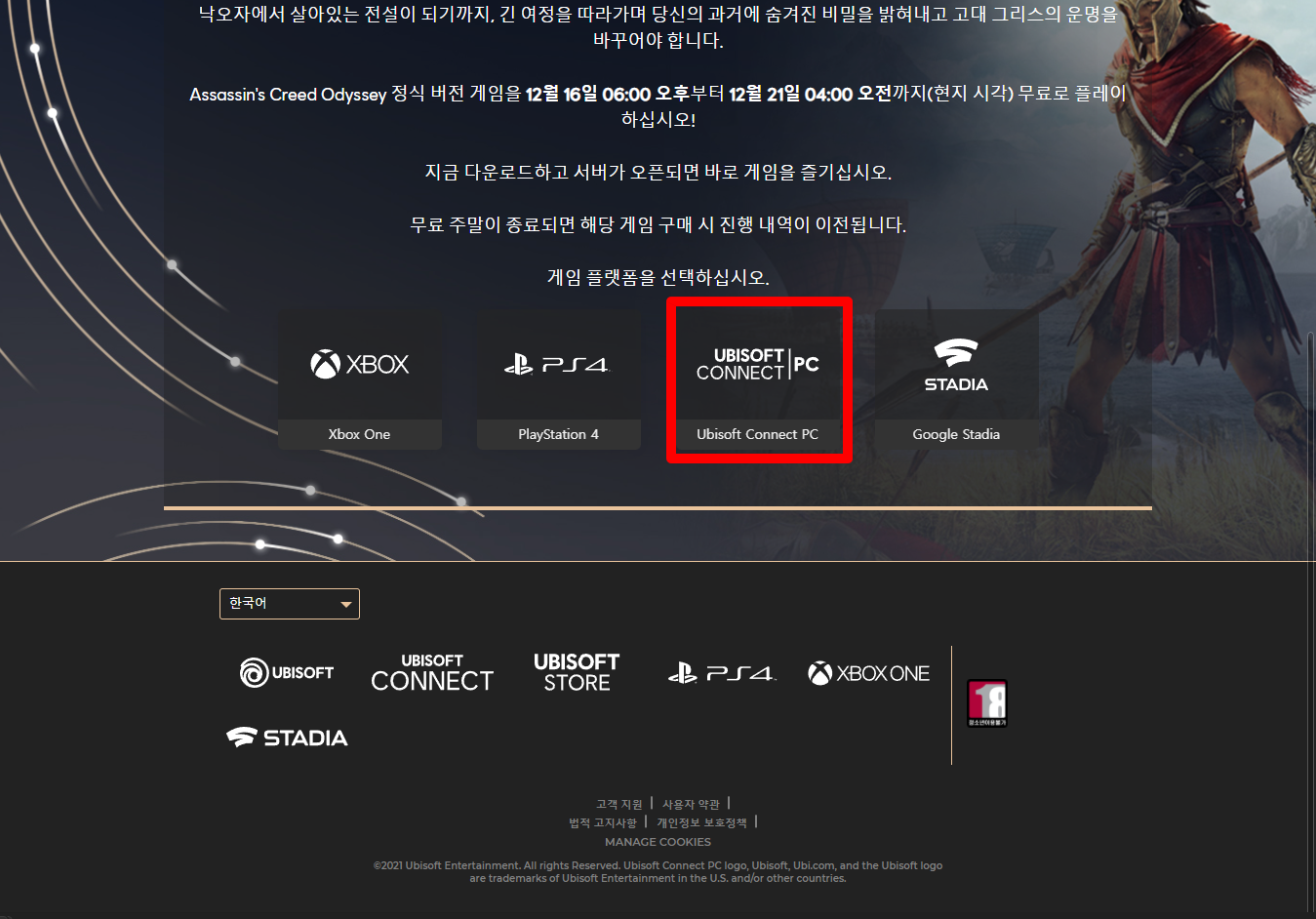 "Assassin's Creed Odyssey" 게임페이지를 조금 내려서 [UBISOFT CONNECT | PC] 버튼을 클릭하면 됩니다.