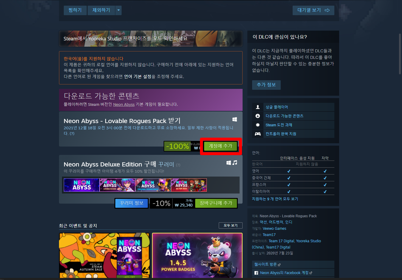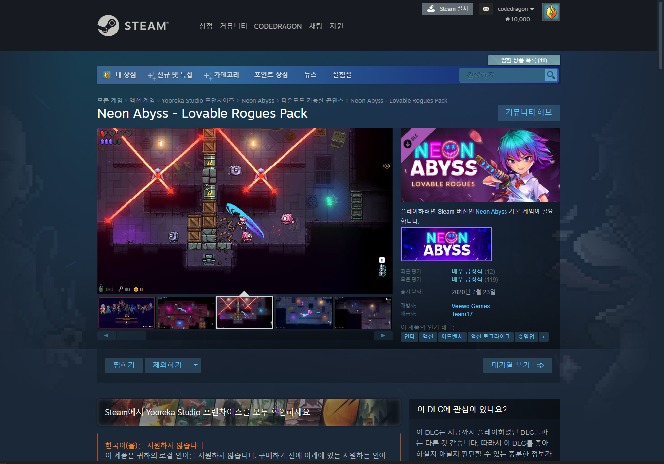 "Neon Abyss - Lovable Rogues Pack" 해당 DLC를 받기 위해서는 베이스게임()을 보유하고 있거나 구매해야 합니다.