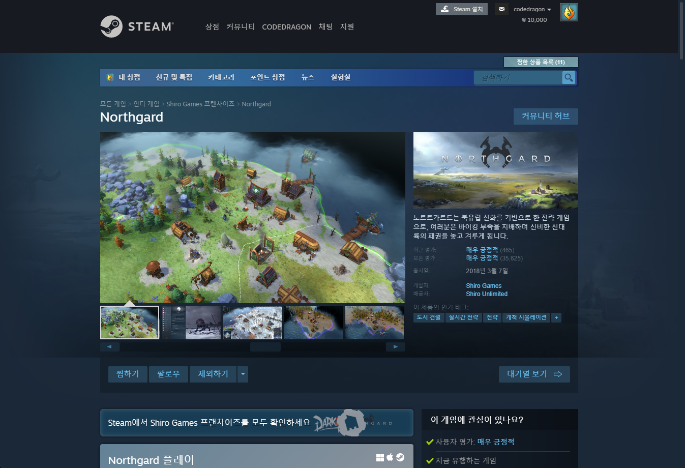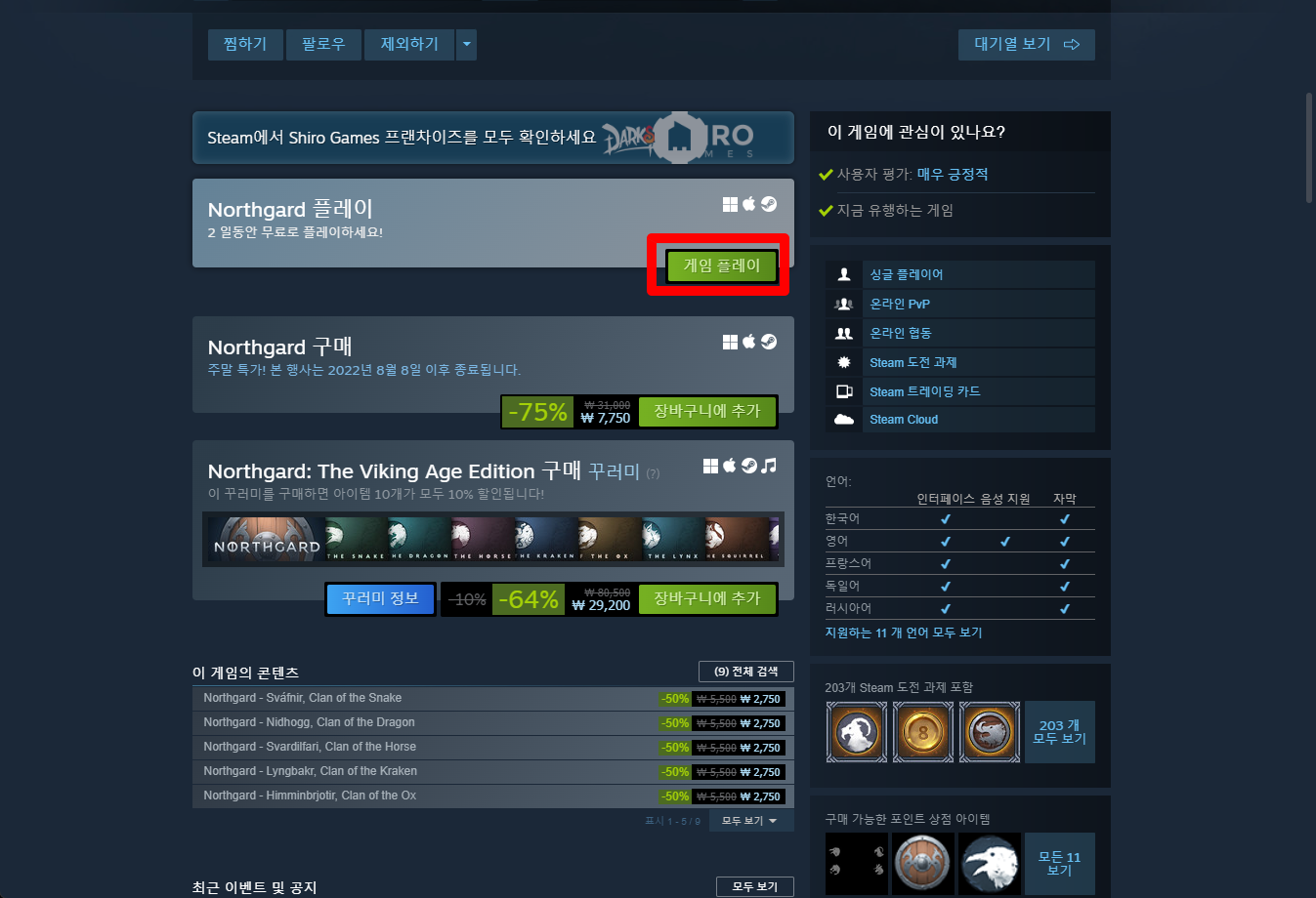"Northgard" 게임페이지를 조금 내려서 [게임 플레이] 버튼을 클릭하면 됩니다.