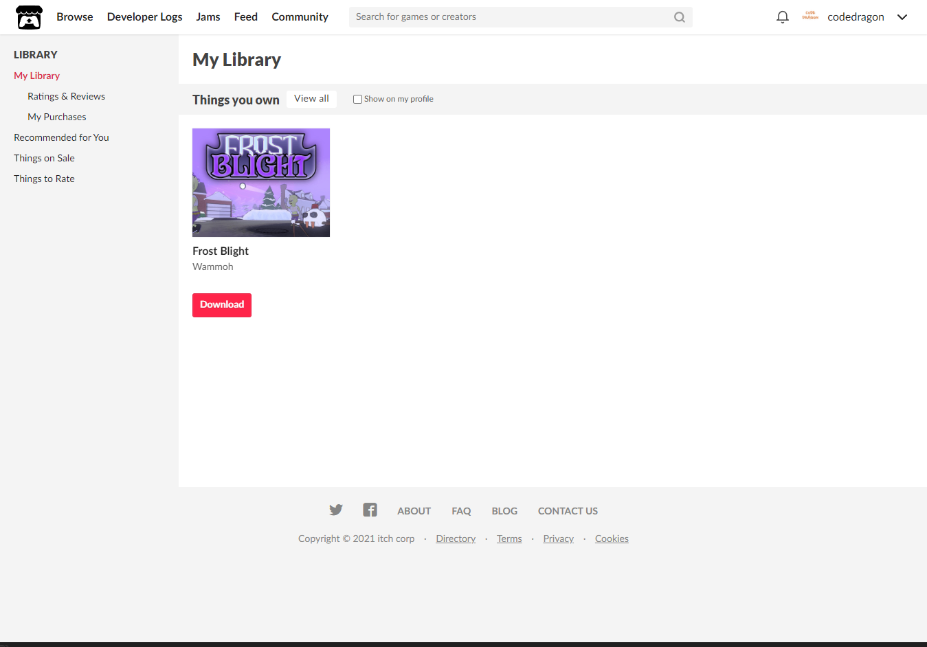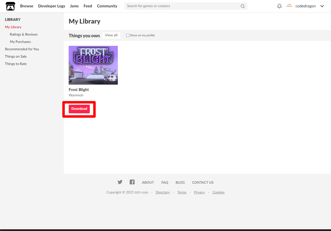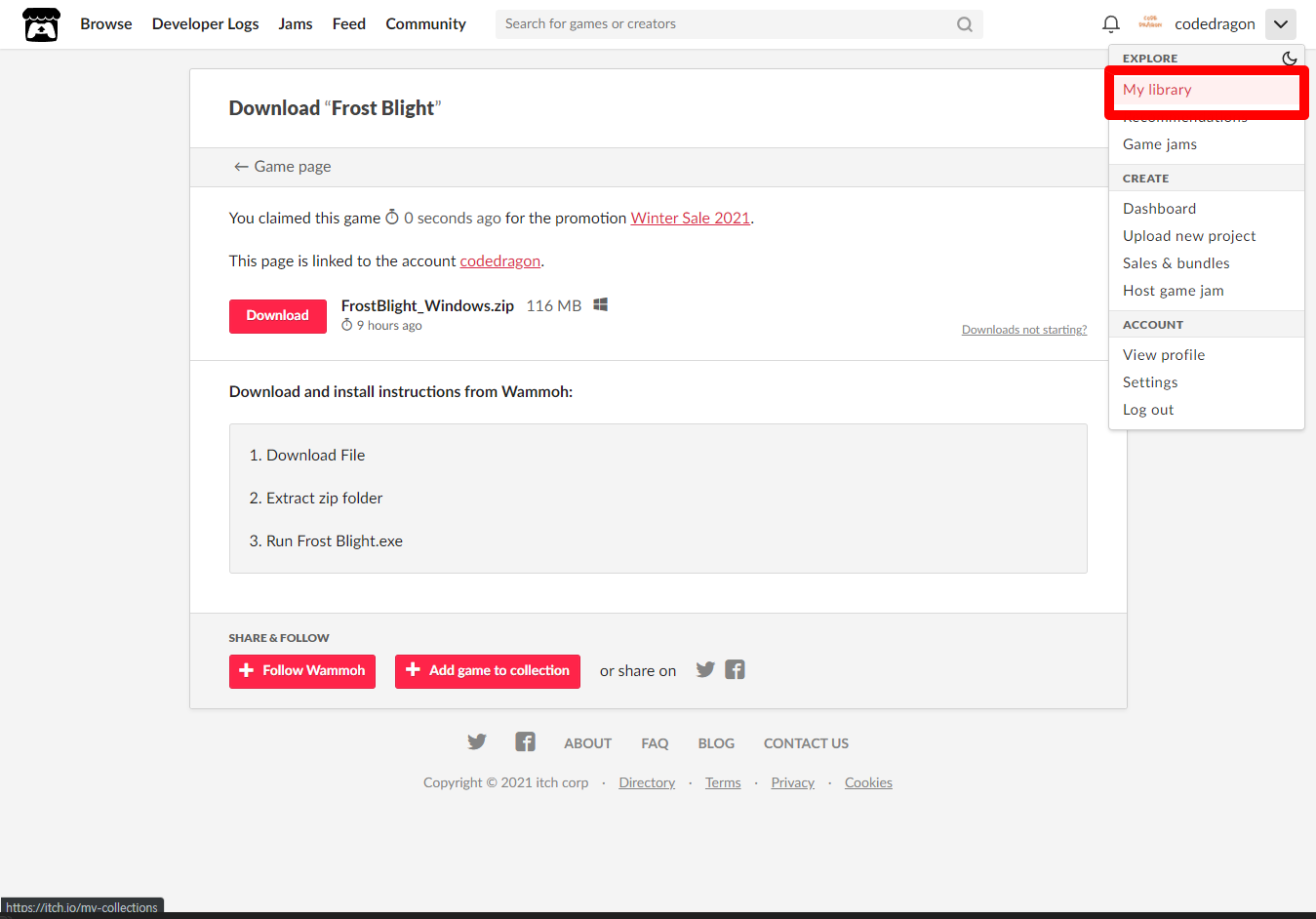 "My Lirary"에서 방금 받은 "Frost Blight" 게임 항목을 확인할 수 있습니다.