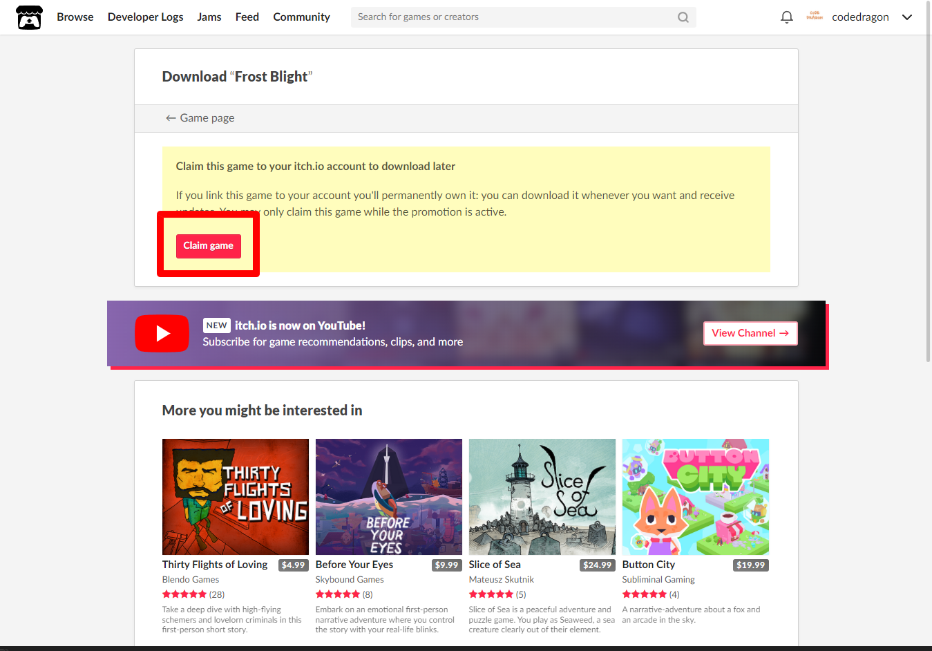 [Claim game]을 클릭하면 나의 게임 라이브러리에 추가되고 설치파일을 다운받을 수 있는 페이지로 이동됩니다.