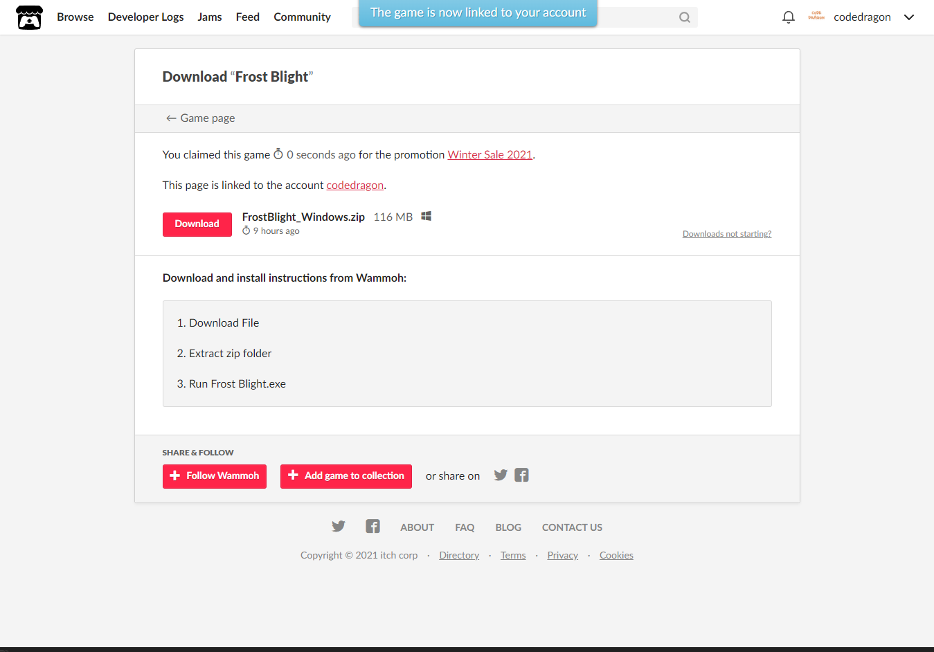 [Claim game]을 클릭하면 나의 게임 라이브러리에 추가되고 설치파일을 다운받을 수 있는 페이지로 이동됩니다.