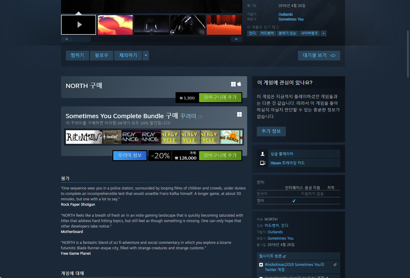 ₩ 1,300 -> ₩ 0(Free) NORTH 노쓰 무료 - 인디갈라 indiegala 무료 소장 기회 기간한정 indiegala FREE GAME, Limited time