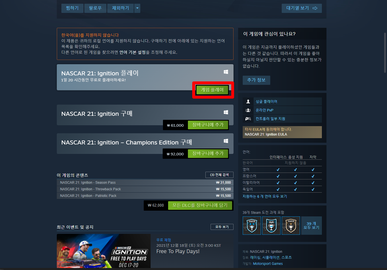 "NASCAR 21: Ignition" 게임페이지를 조금 내려서 [게임 플레이] 버튼을 클릭하면 됩니다.