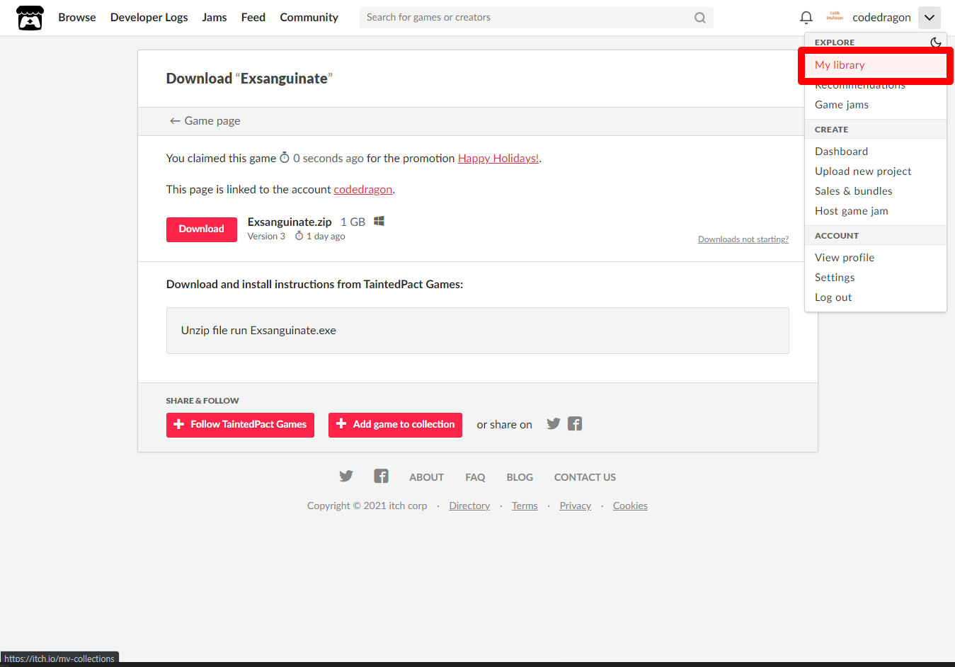 "My Lirary"에서 방금 받은 "Exsanguinate" 게임 항목을 확인할 수 있습니다.
