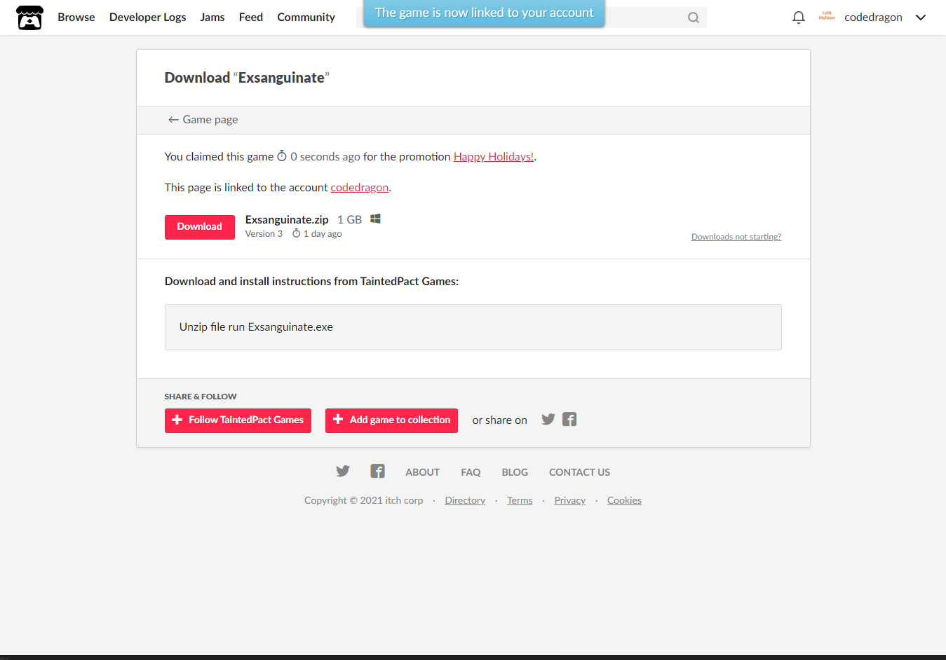 [Claim game]을 클릭하면 나의 게임 라이브러리에 추가되고 설치파일을 다운받을 수 있는 페이지로 이동됩니다.