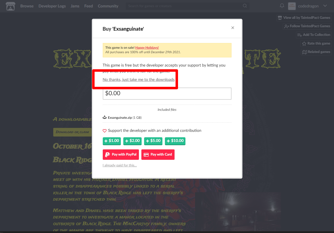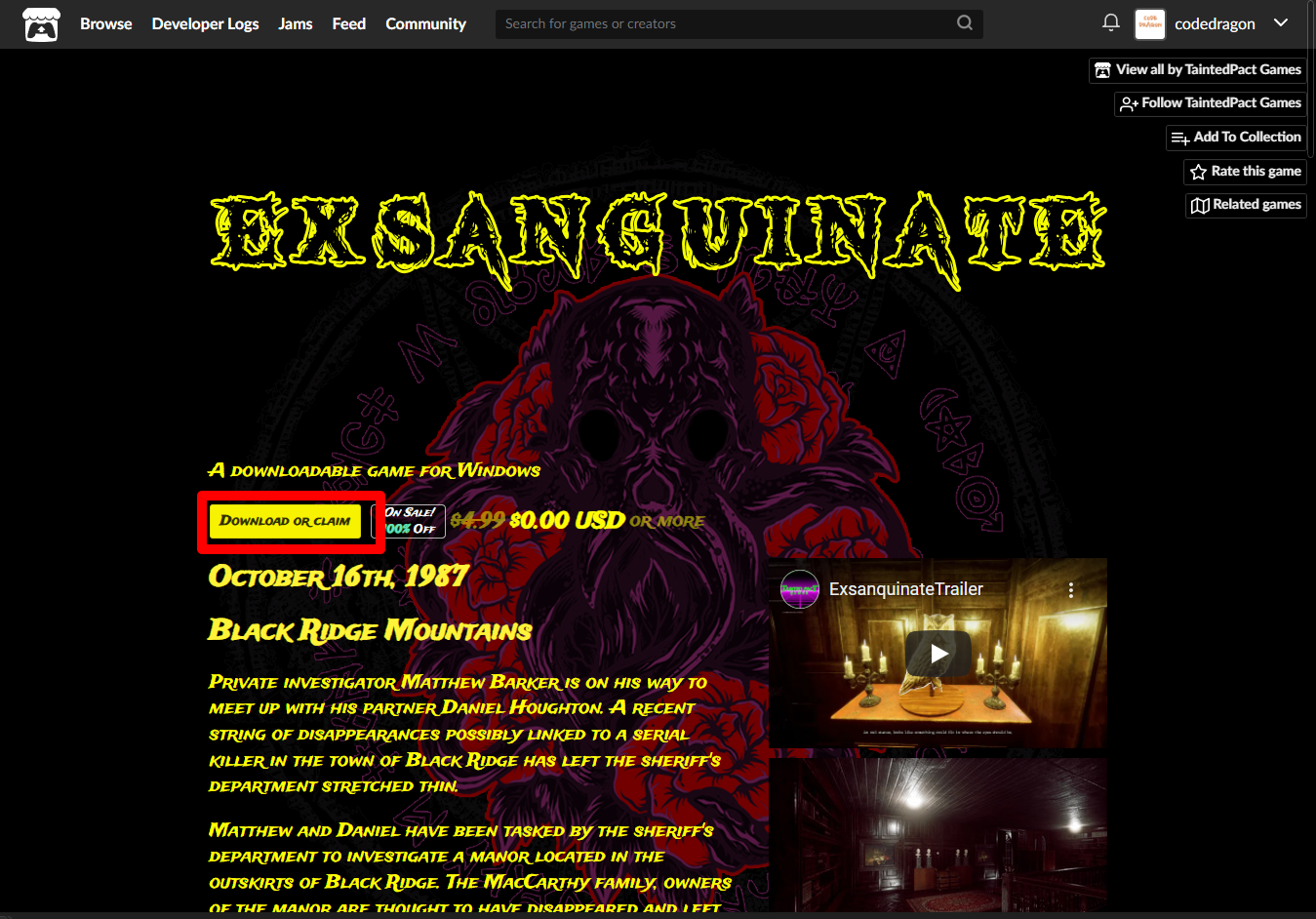"Exsanguinate" 해당 항목에 있는 [Download] 버튼을 클릭하면 게임의 설치파일을 다운받을 수 있습니다.