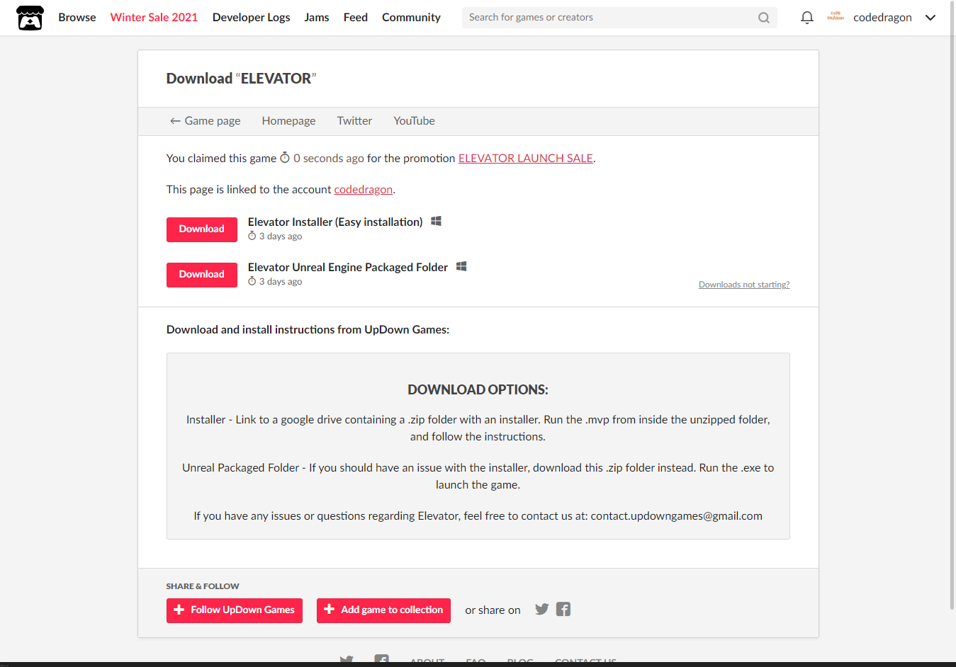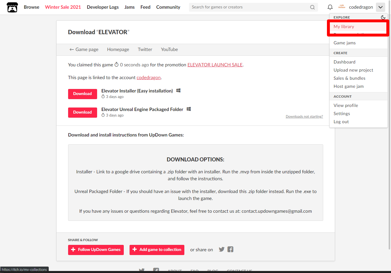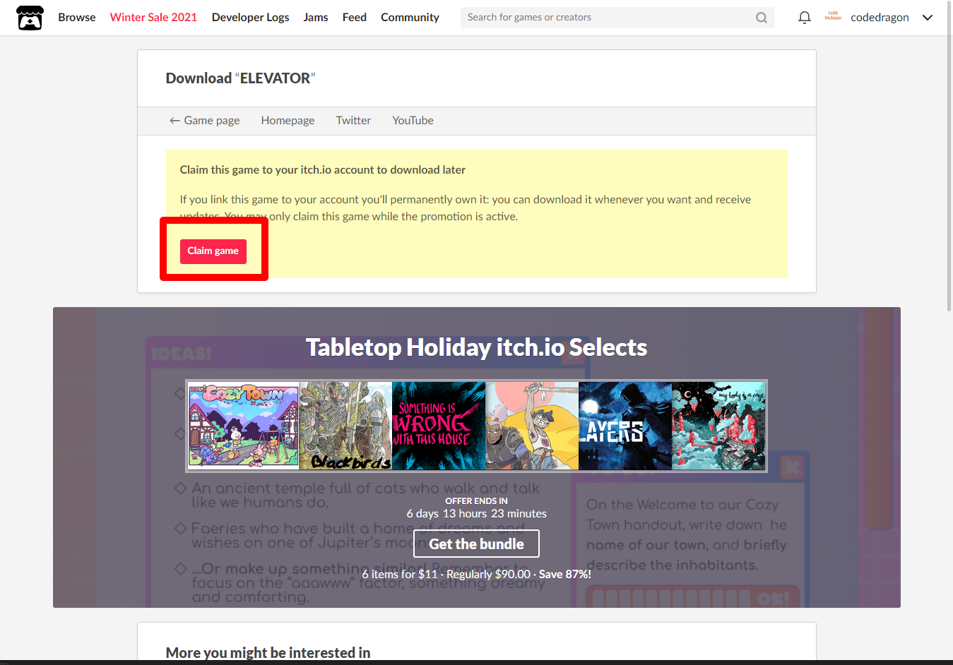 [Claim game]을 클릭하면 "ELEVATOR" 게임이 나의 게임 라이브러리에 추가되고 설치파일을 다운받을 수 있는 페이지로 이동됩니다.