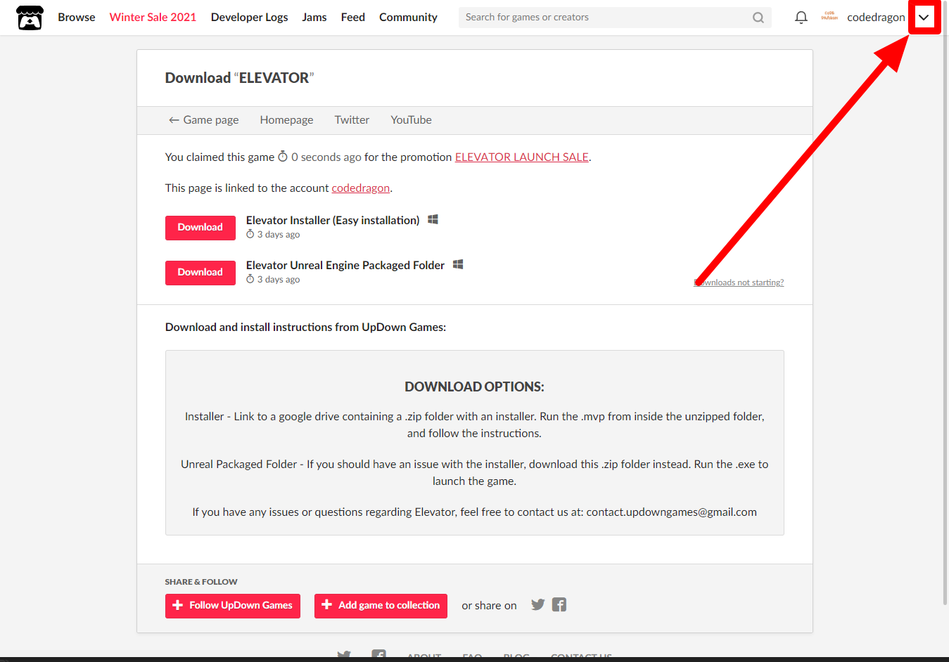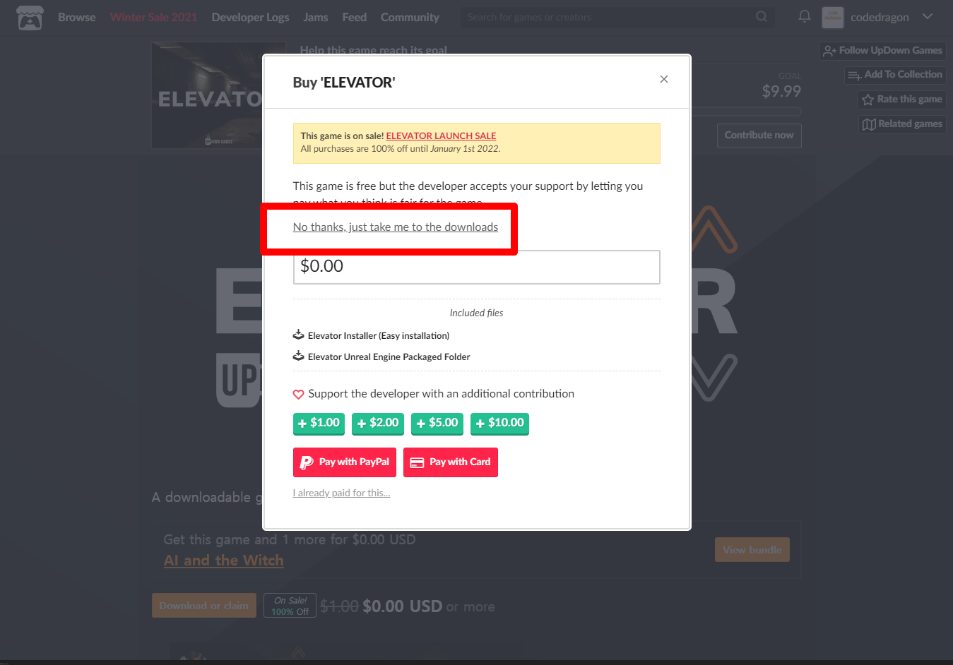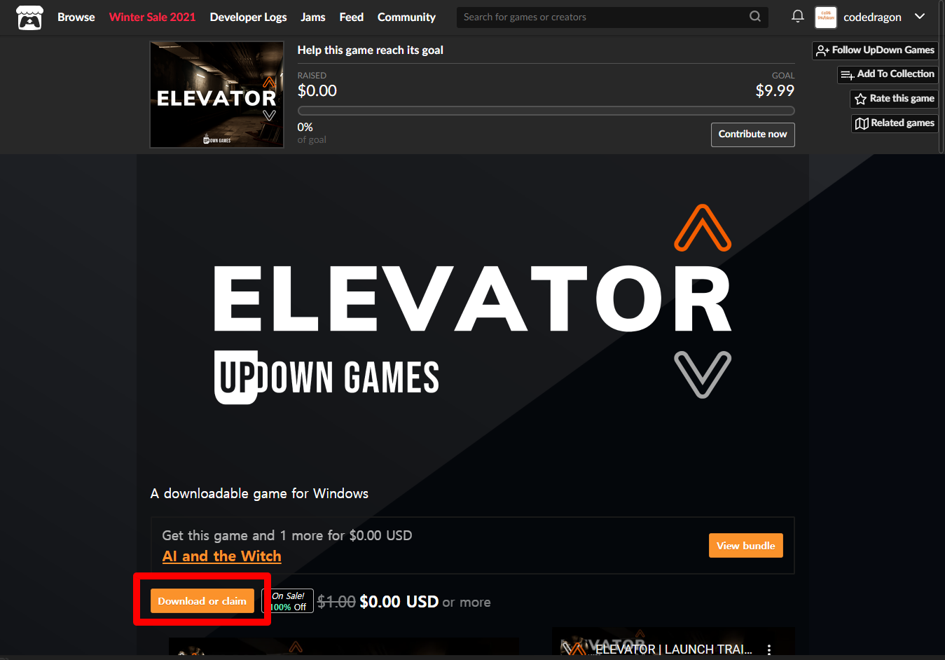 [Claim game]을 클릭하면 "ELEVATOR" 게임이 나의 게임 라이브러리에 추가되고 설치파일을 다운받을 수 있는 페이지로 이동됩니다.