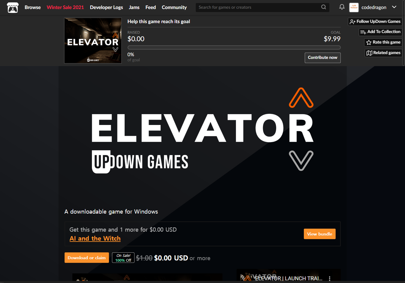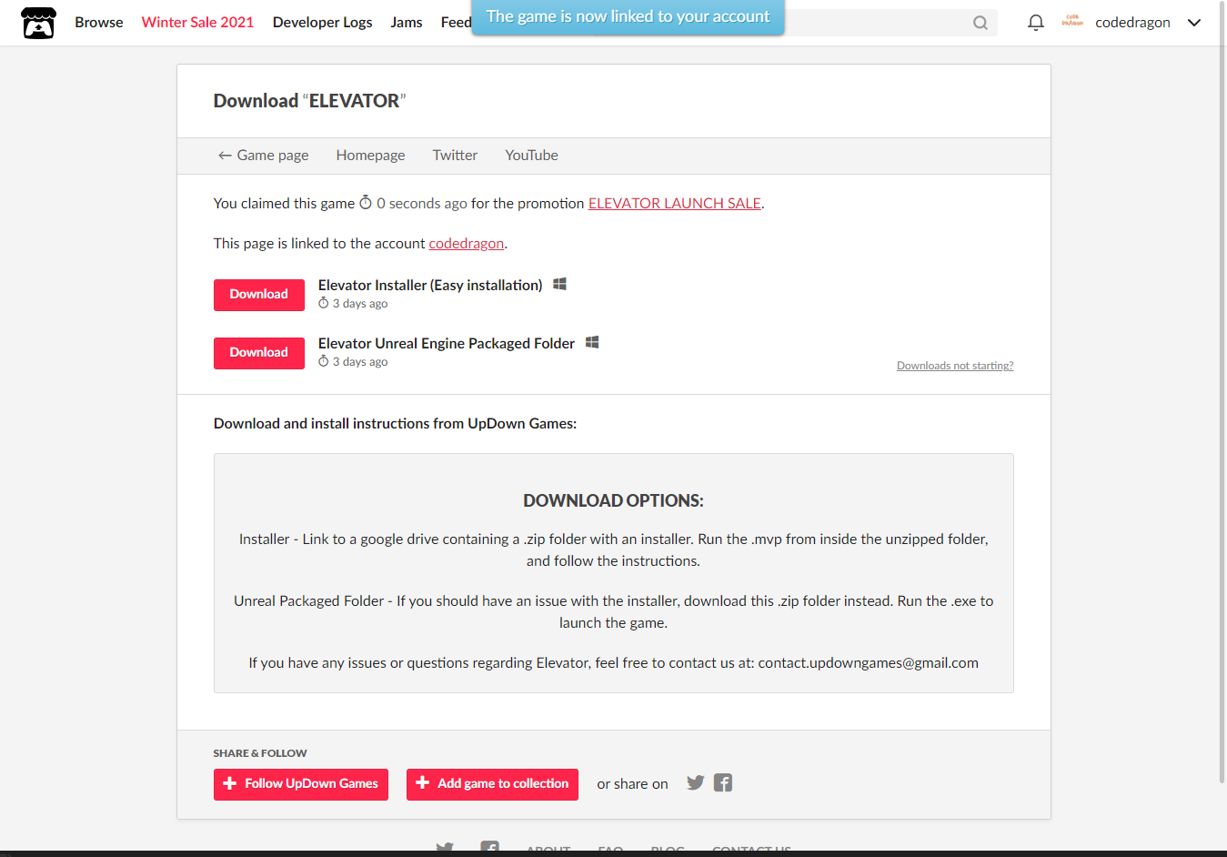 [Claim game]을 클릭하면 "ELEVATOR" 게임이 나의 게임 라이브러리에 추가되고 설치파일을 다운받을 수 있는 페이지로 이동됩니다.