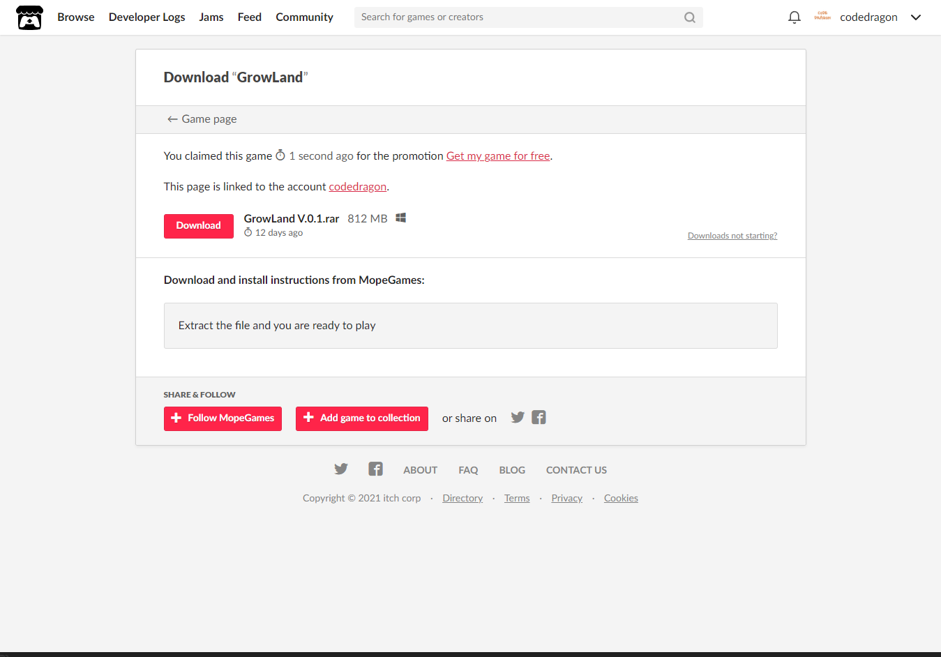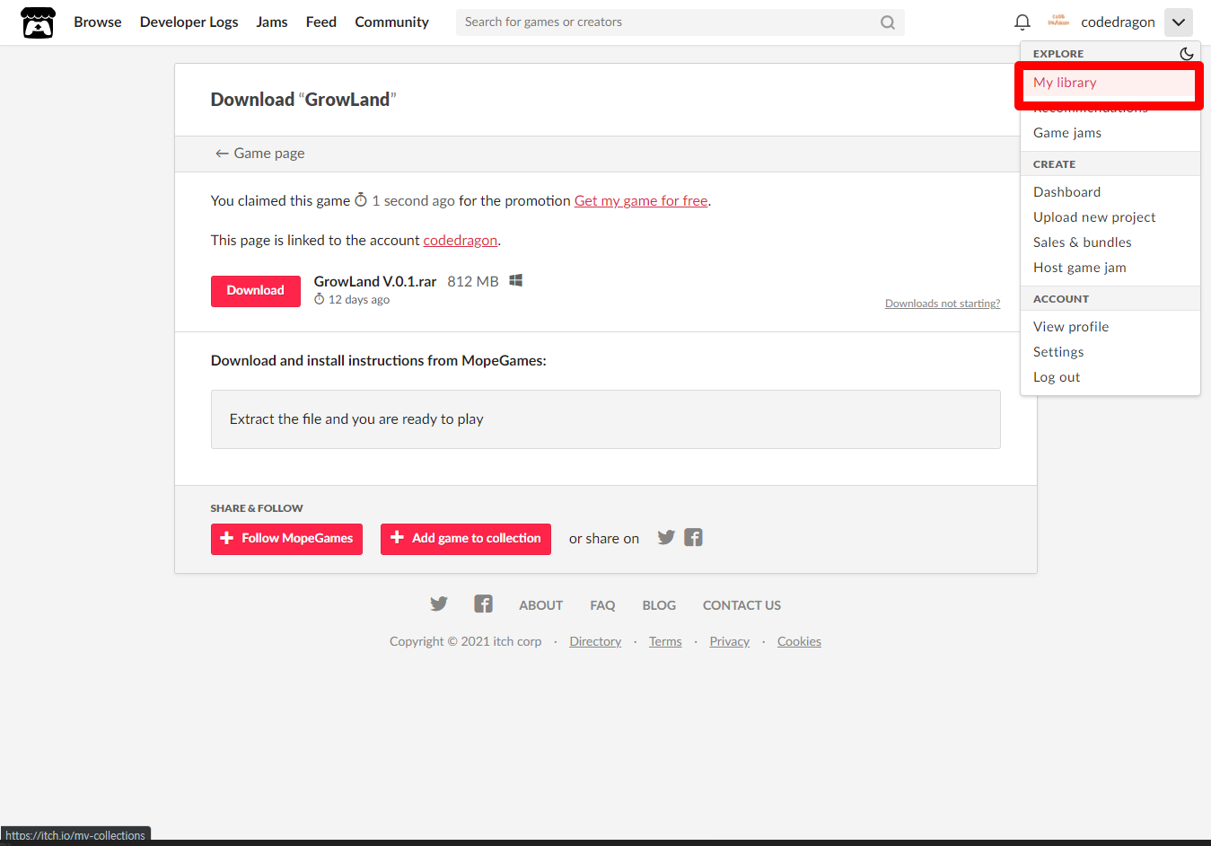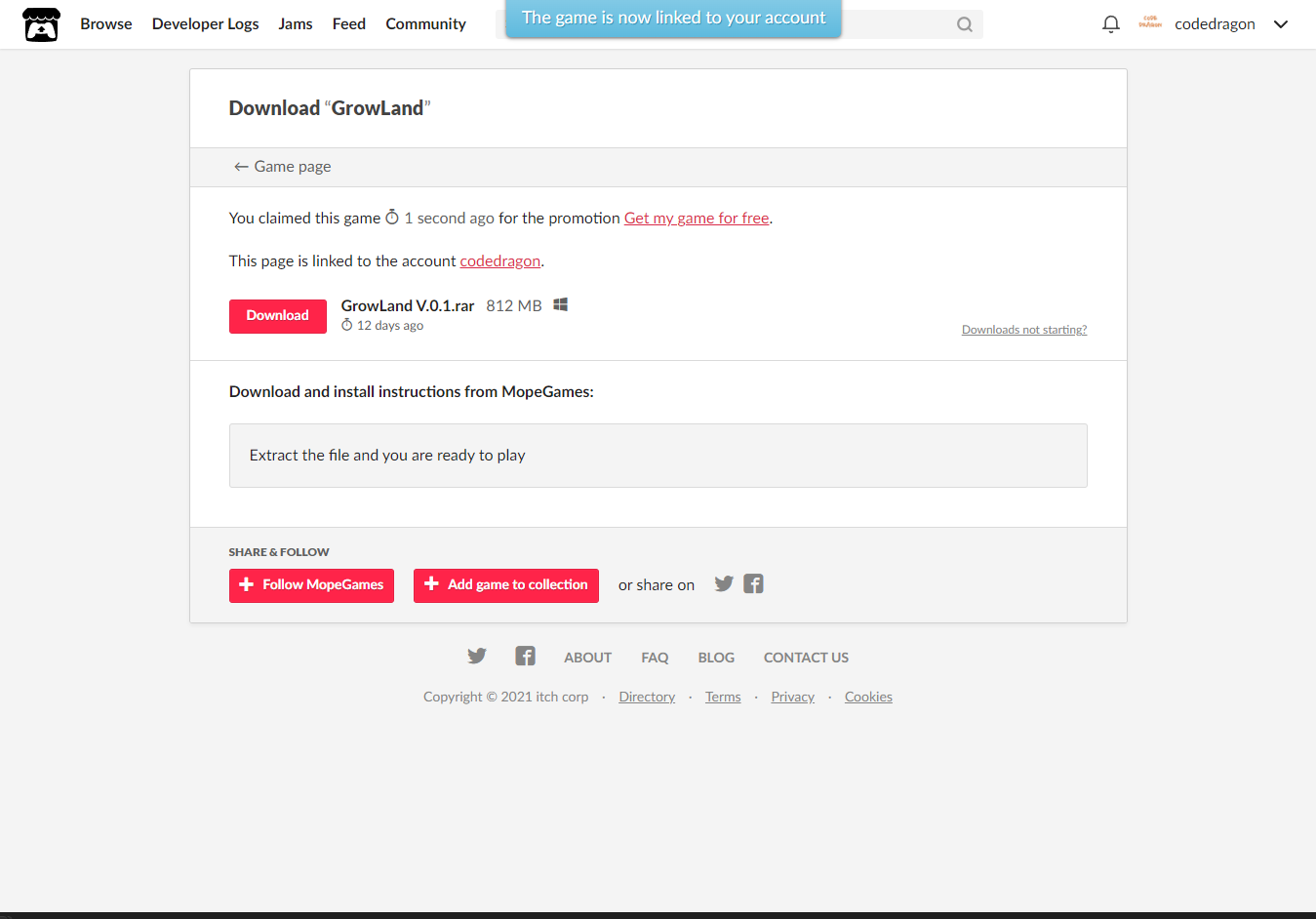 [Claim game]을 클릭하면 나의 게임 라이브러리에 추가되고 설치파일을 다운받을 수 있는 페이지로 이동됩니다.