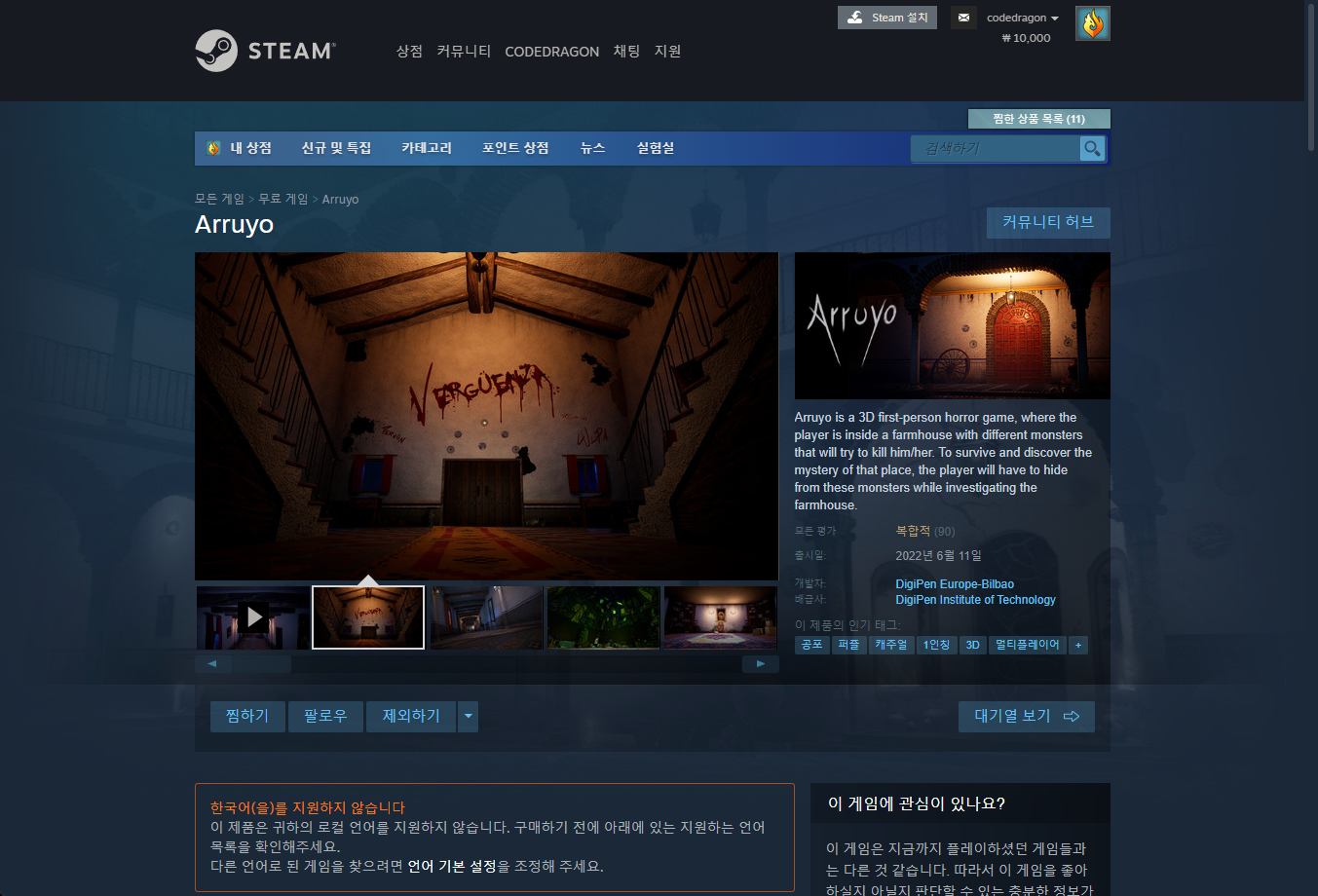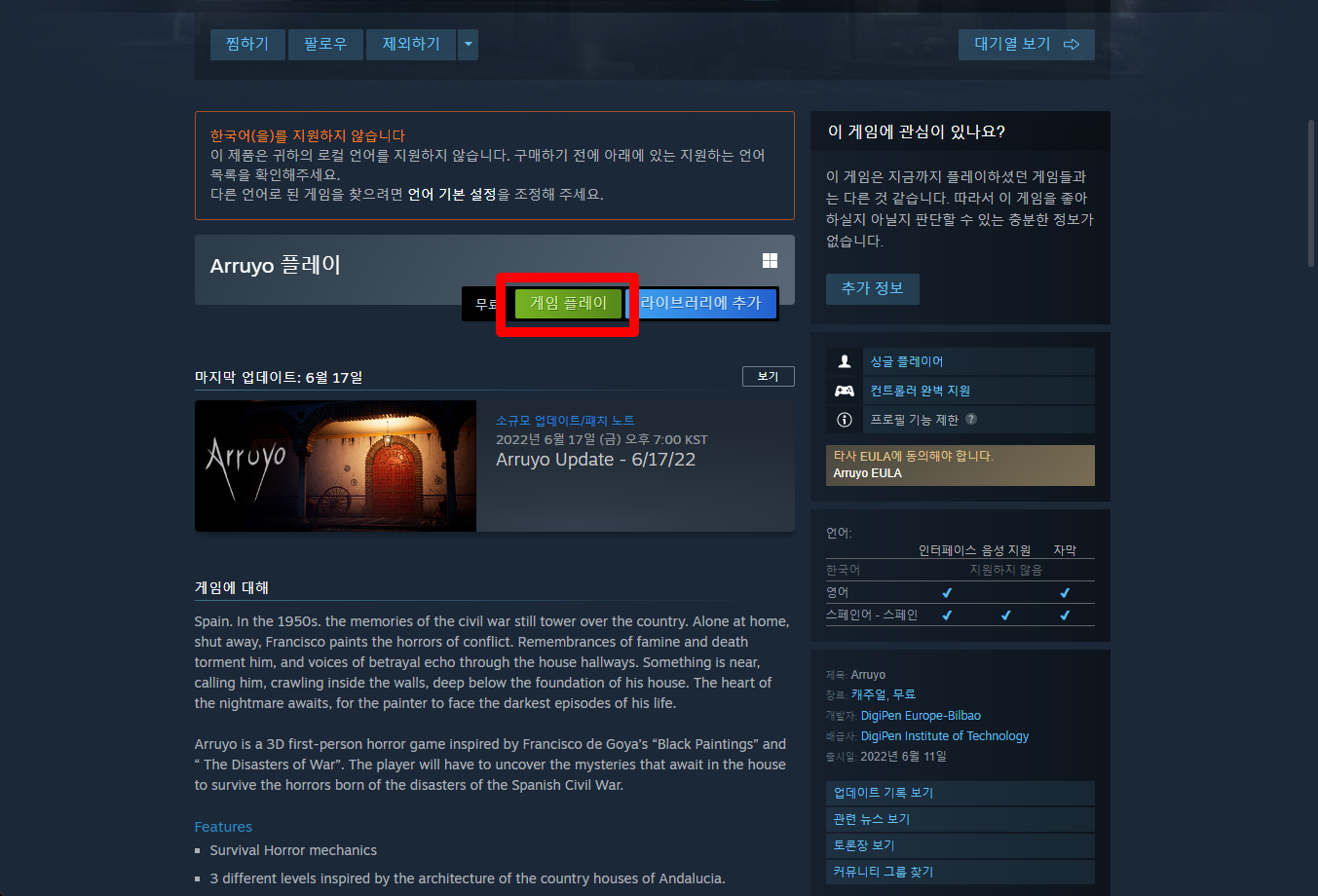 "Arruyo" 페이지를 내려 [게임 플레이]를 클릭하면 됩니다.
