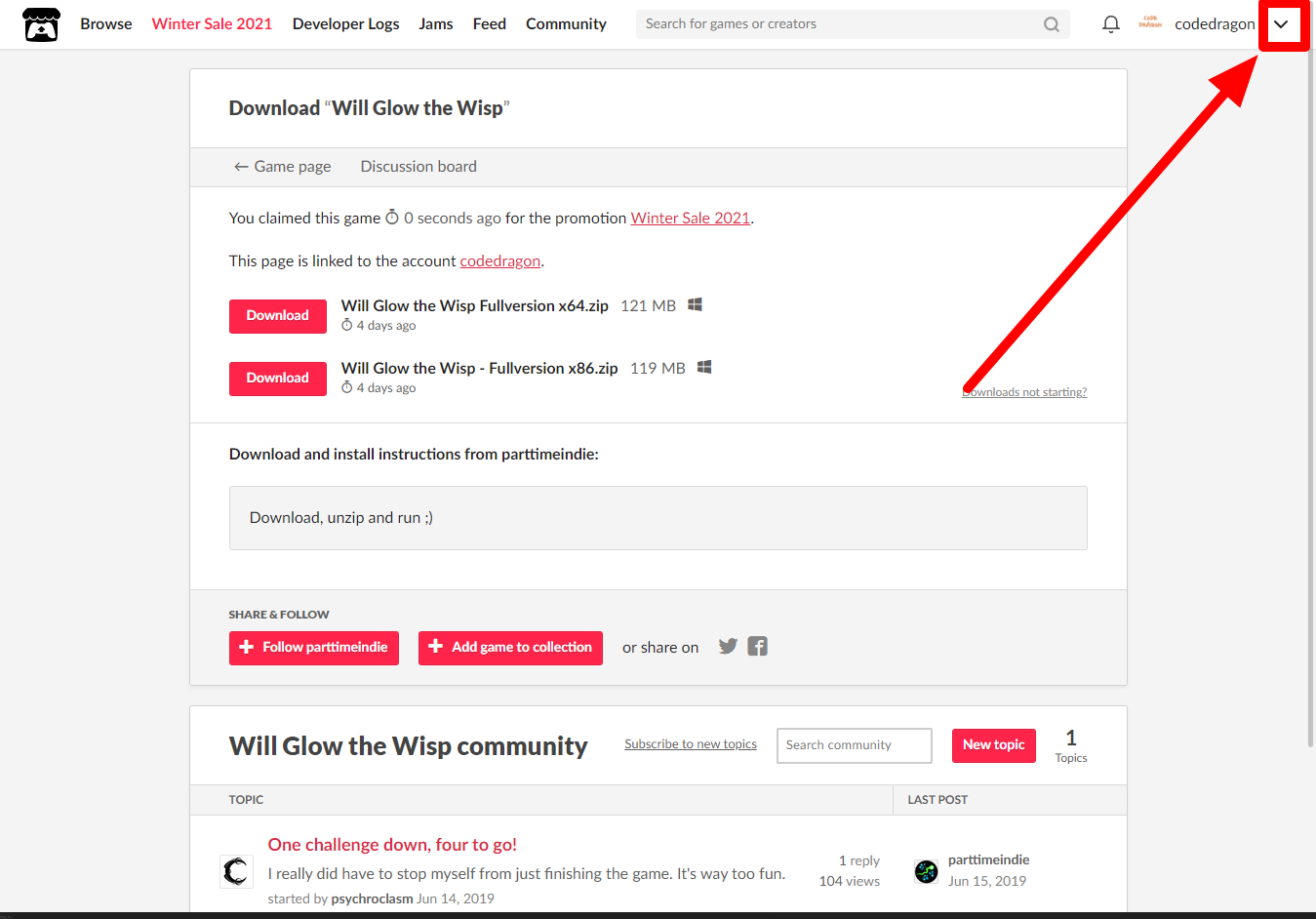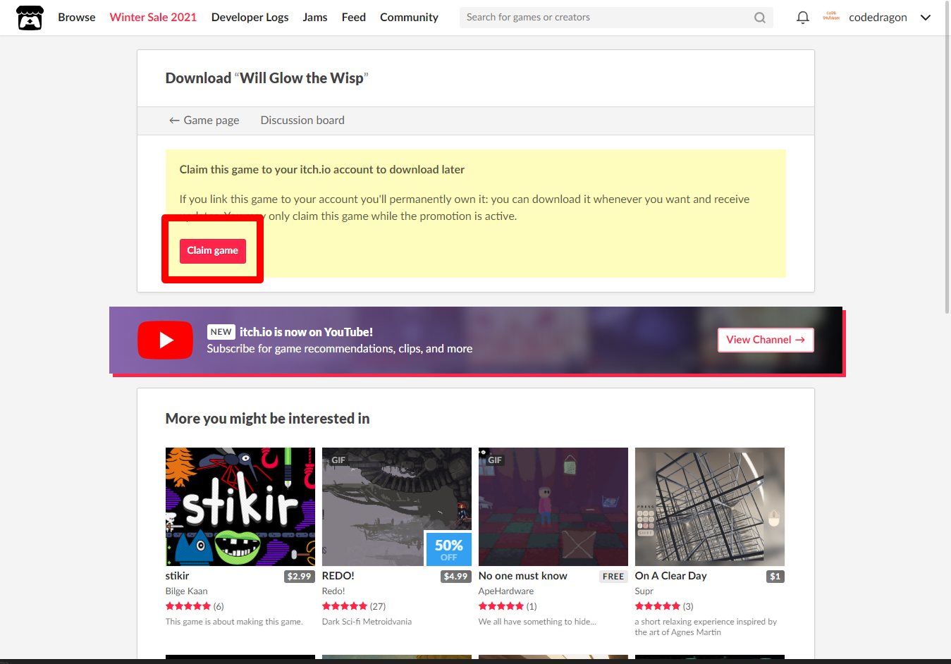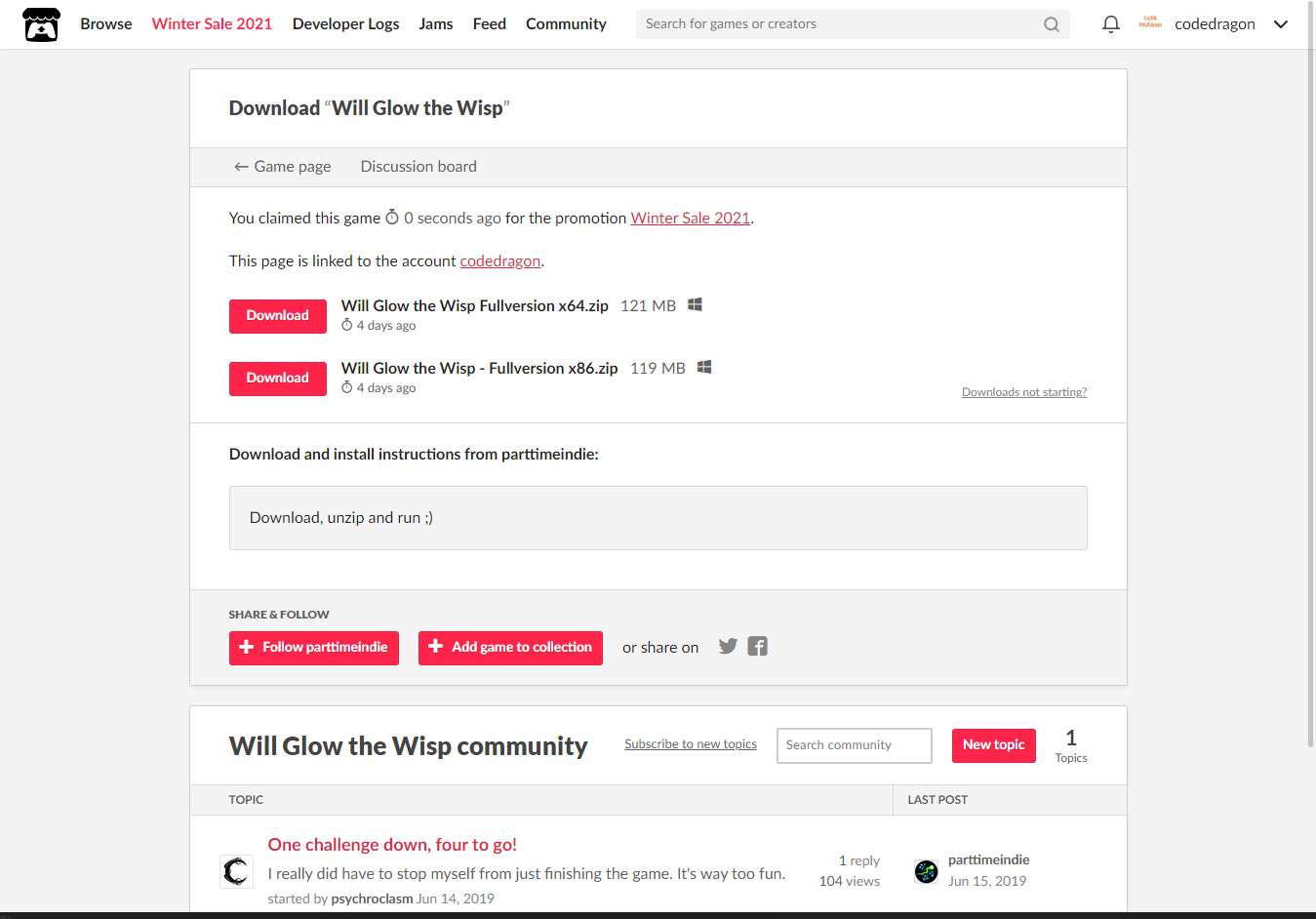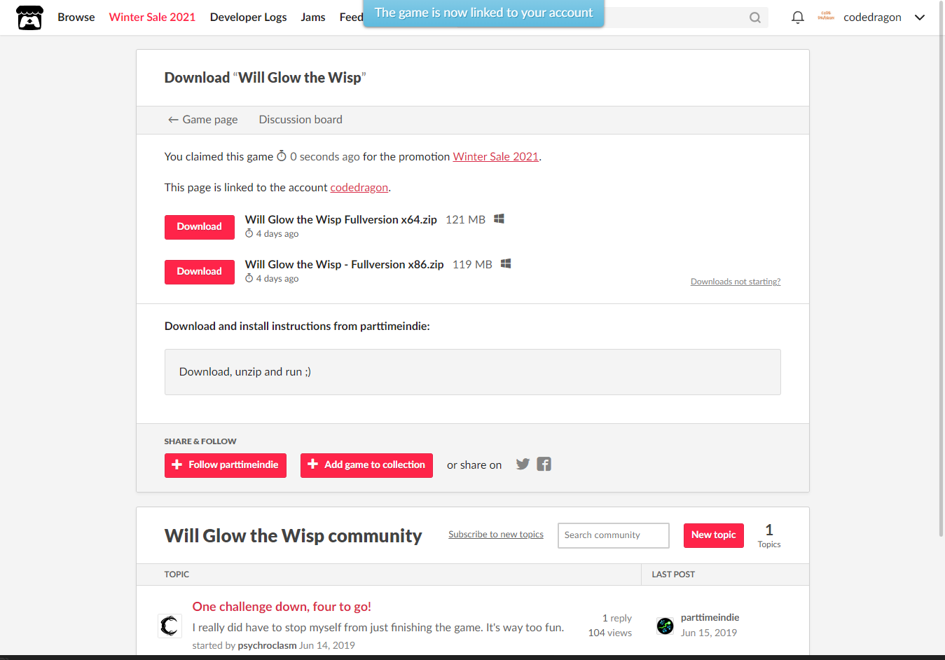 [Claim game]을 클릭하면 "Will Glow the Wisp" 게임이 나의 게임 라이브러리에 추가되고 설치파일을 다운받을 수 있는 페이지로 이동됩니다.