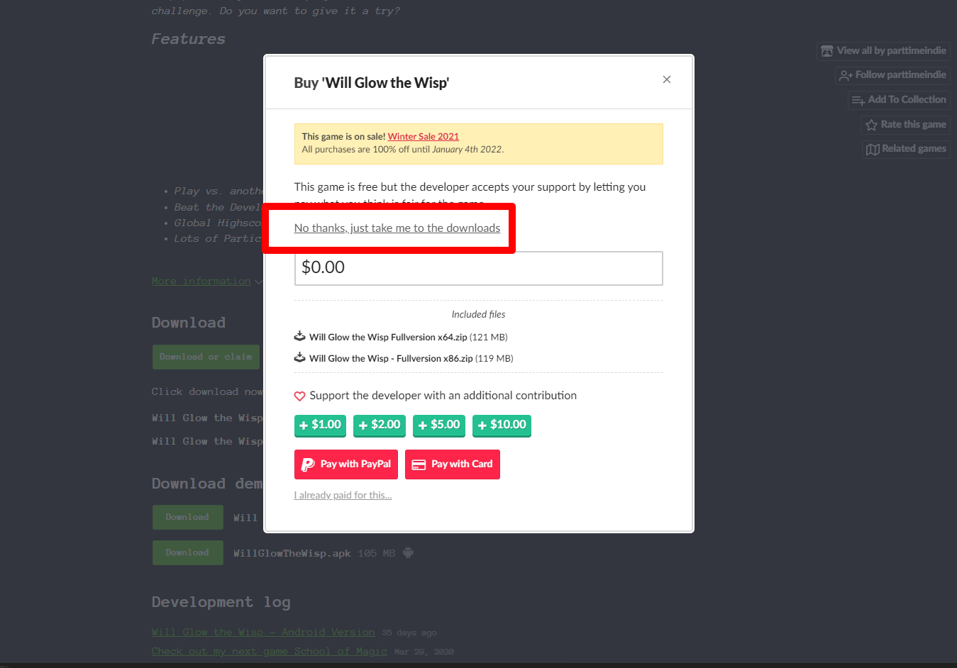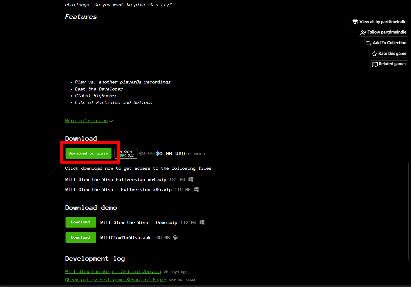 "Will Glow the Wisp" 페이지를 조금 내린 후 [Download or claim]을 클릭합니다.