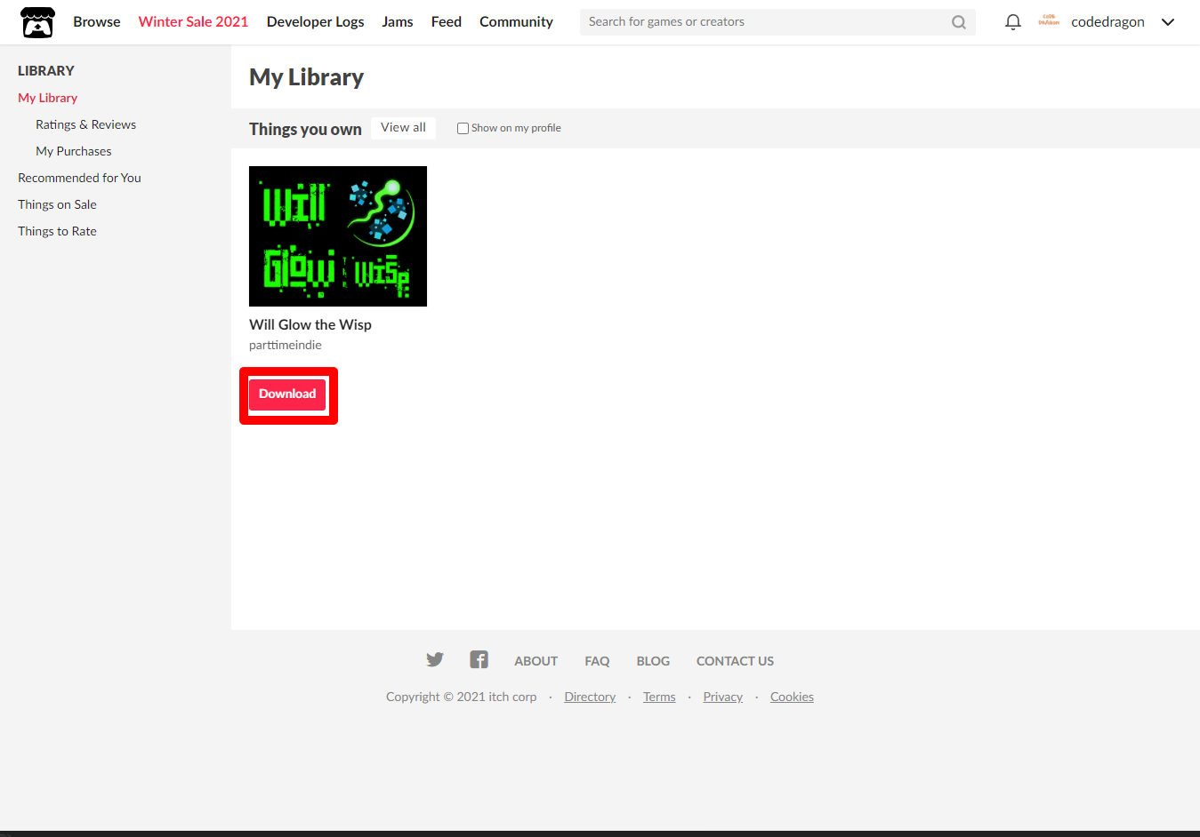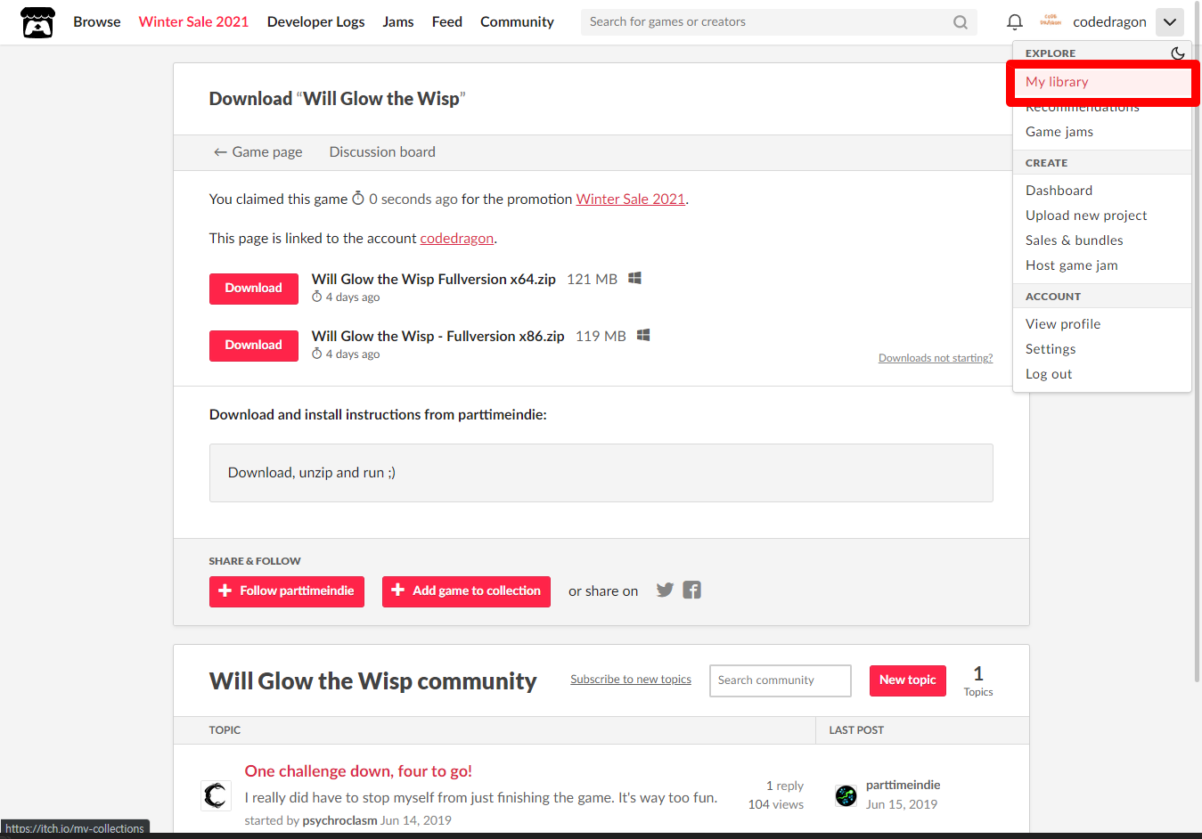"My Lirary"에서 방금 받은 "Will Glow the Wisp" 게임 항목을 확인할 수 있습니다.