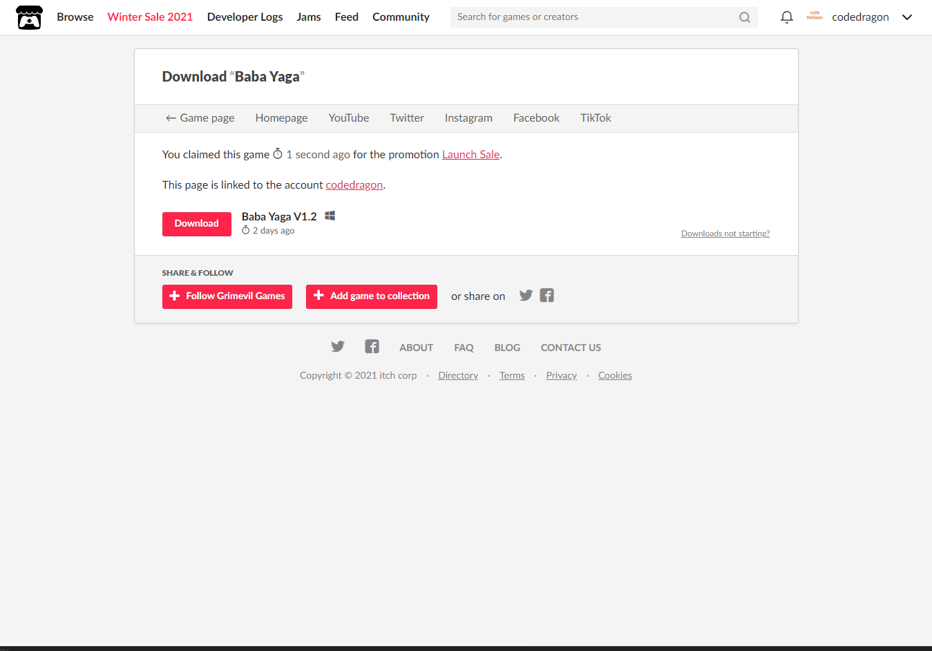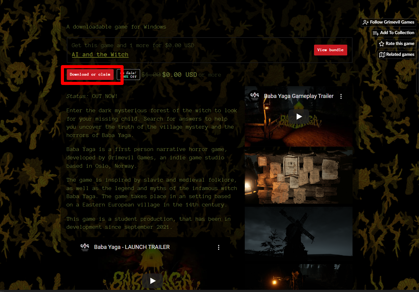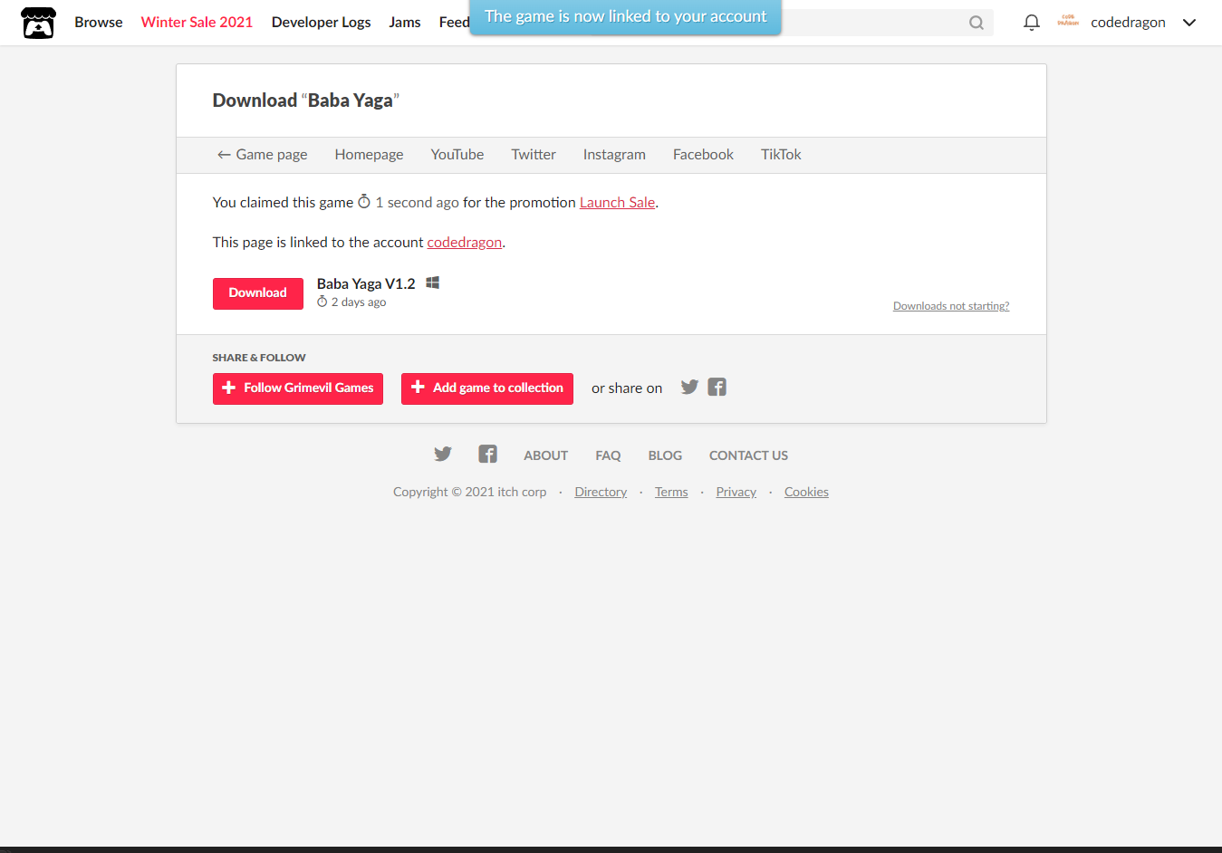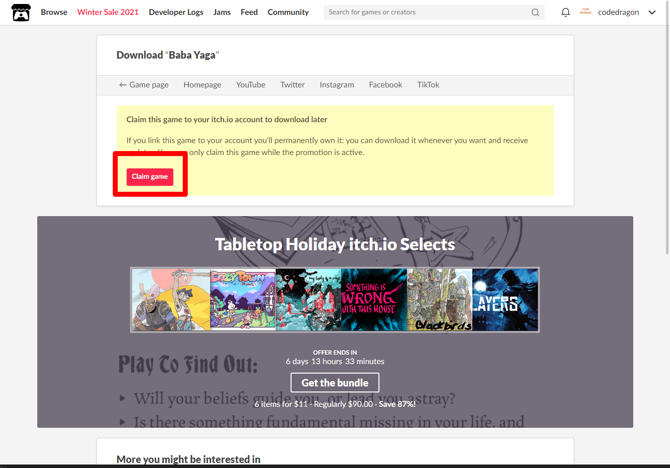 [Claim game]을 클릭하면 "Baba Yaga" 게임이 나의 게임 라이브러리에 추가되고 설치파일을 다운받을 수 있는 페이지로 이동됩니다.