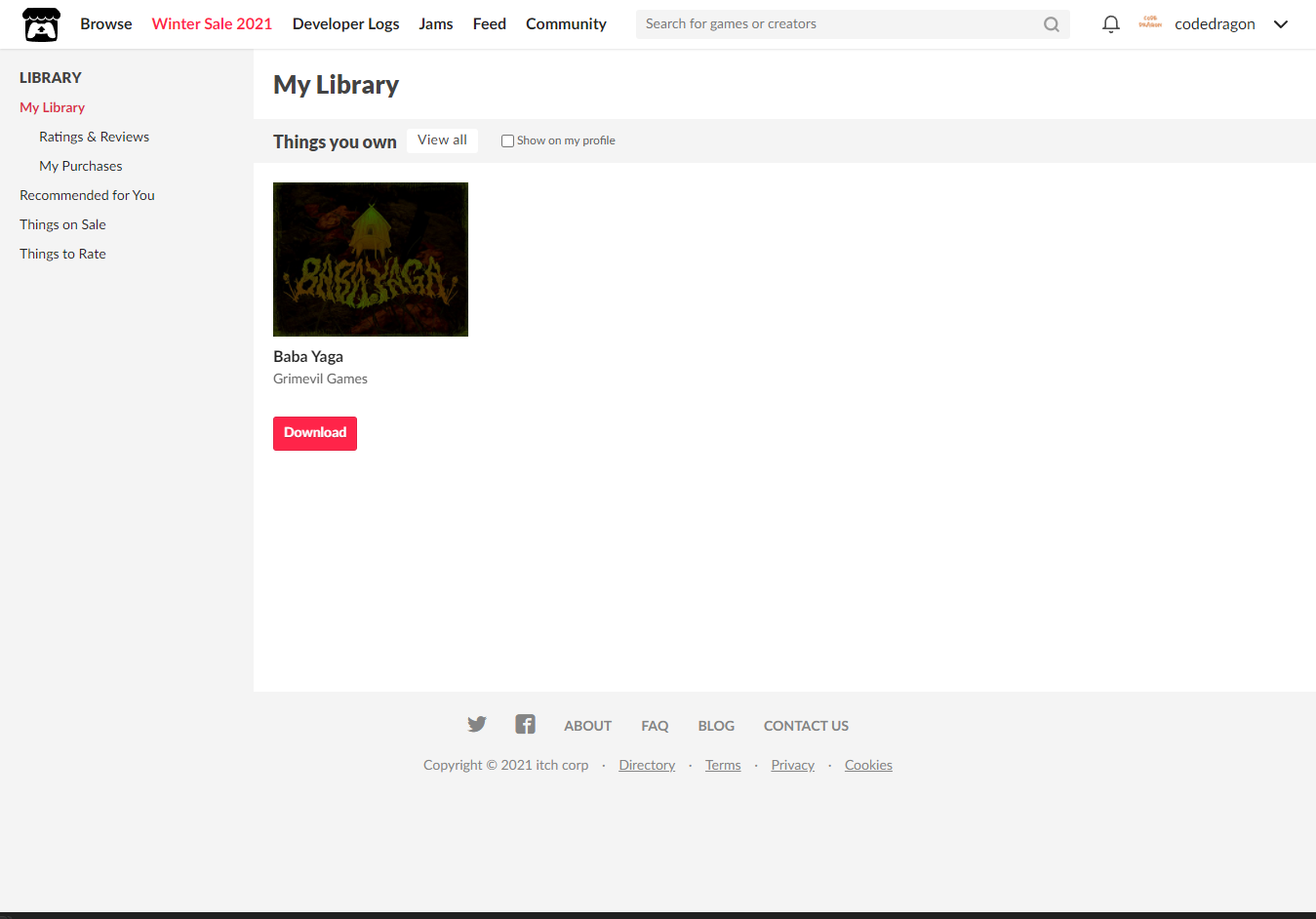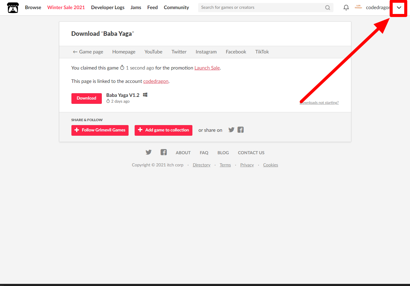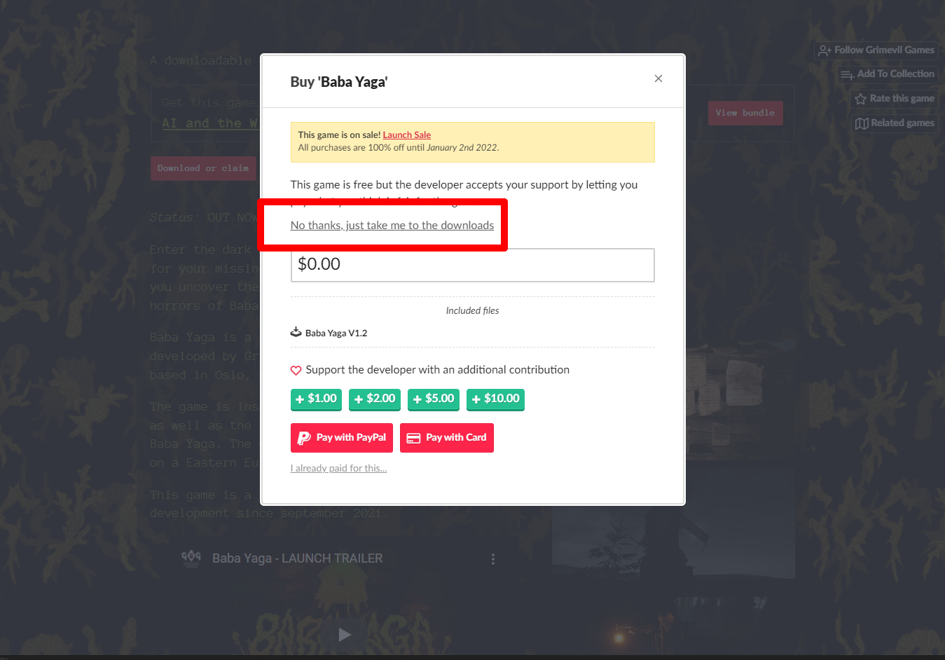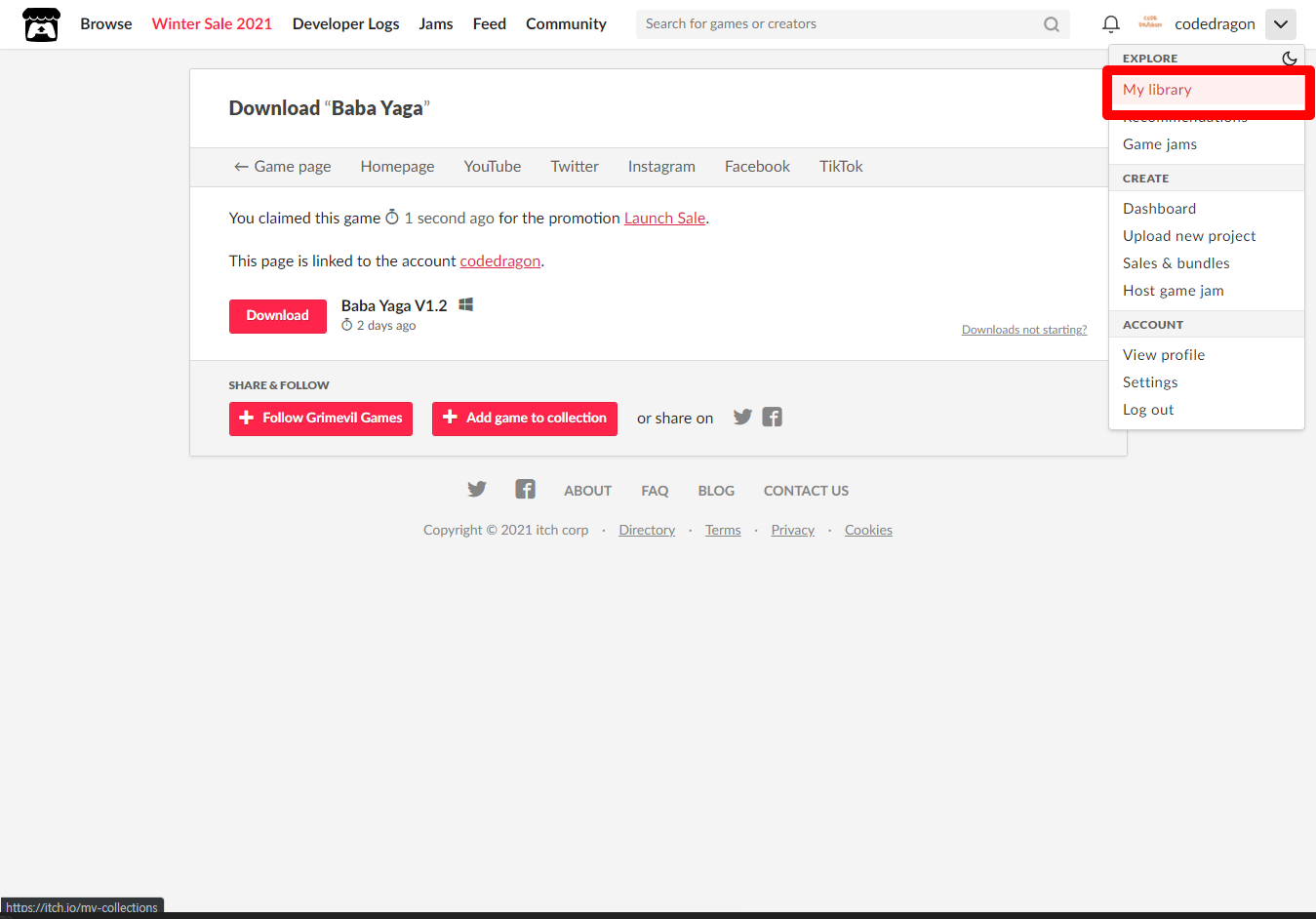 [Claim game]을 클릭하면 "Baba Yaga" 게임이 나의 게임 라이브러리에 추가되고 설치파일을 다운받을 수 있는 페이지로 이동됩니다.