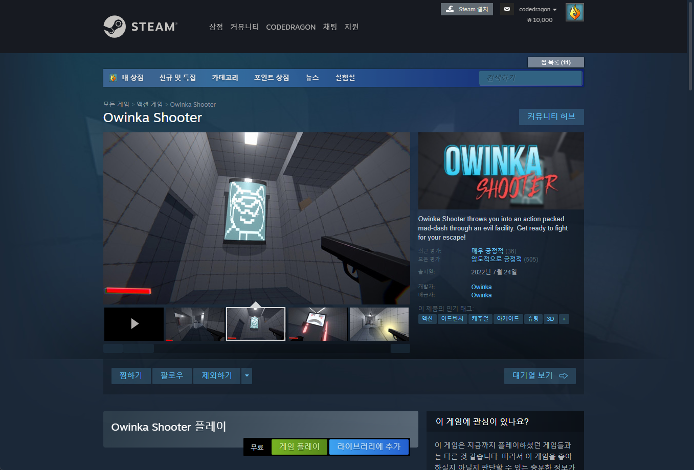 "Owinka Shooter" 스팀 페이지 입니다.