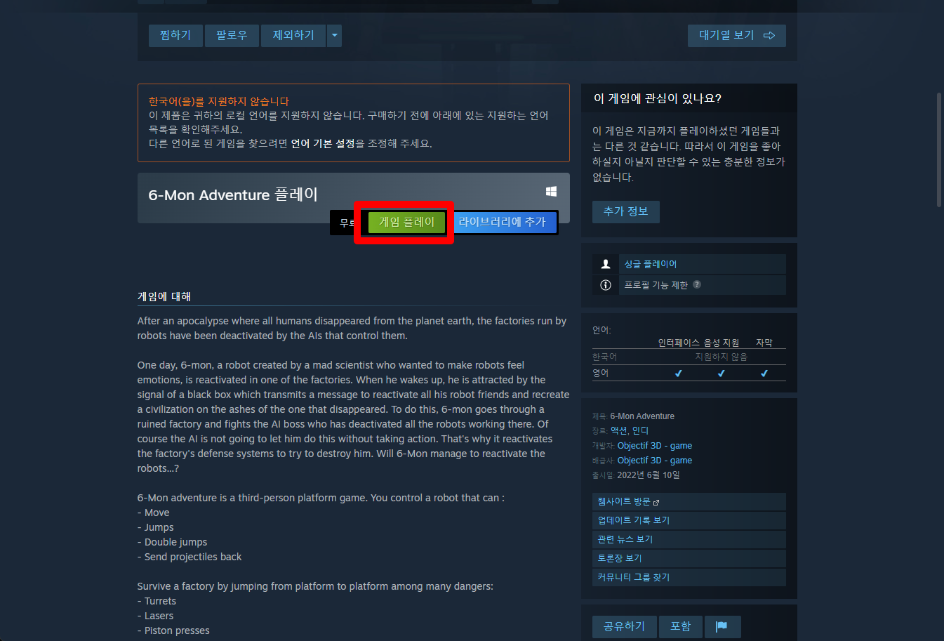 "6-Mon Adventure" 페이지를 내려 [게임 플레이]를 클릭하면 됩니다.