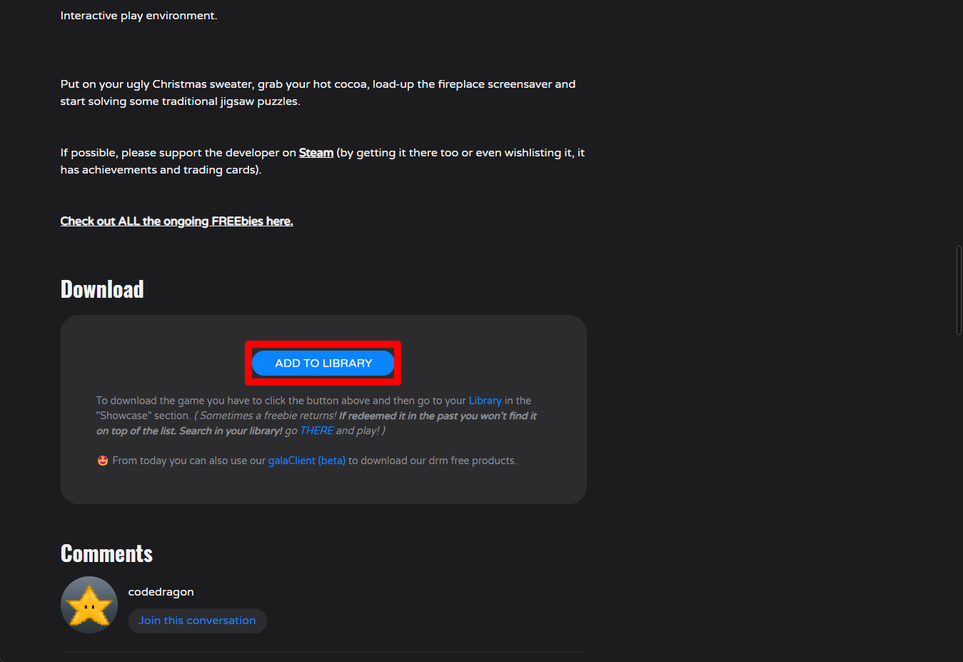 "Pixel Puzzles 2: Christmas" 게임 페이지를 내려 [ADD TO LIBRARY]를 클릭합니다.