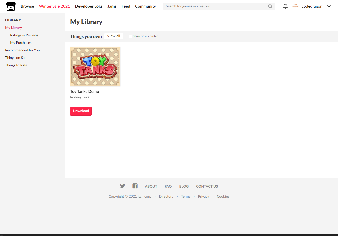 [Claim game]을 클릭하면 "Toy Tanks" 게임이 나의 게임 라이브러리에 추가되고 설치파일을 다운받을 수 있는 페이지로 이동됩니다.