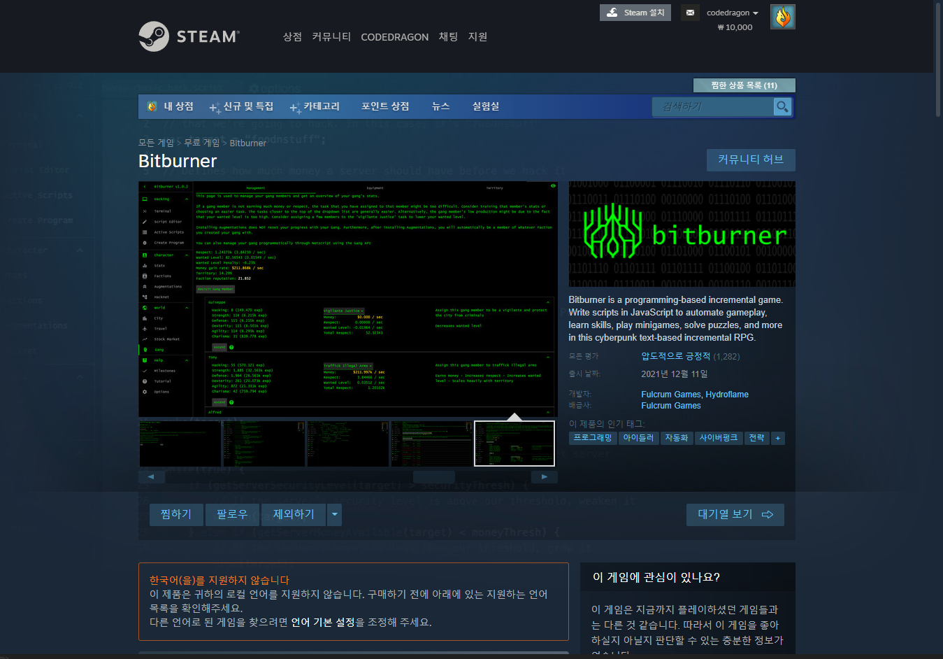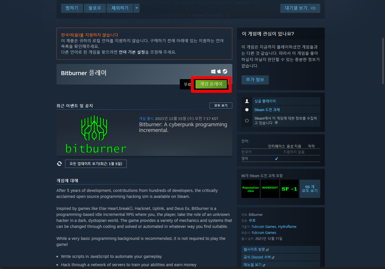 "Bitburner"게임 페이지를 다시 확인해보면 녹색으로 "라이브러리에 있음"으로 표시되어 있습니다.