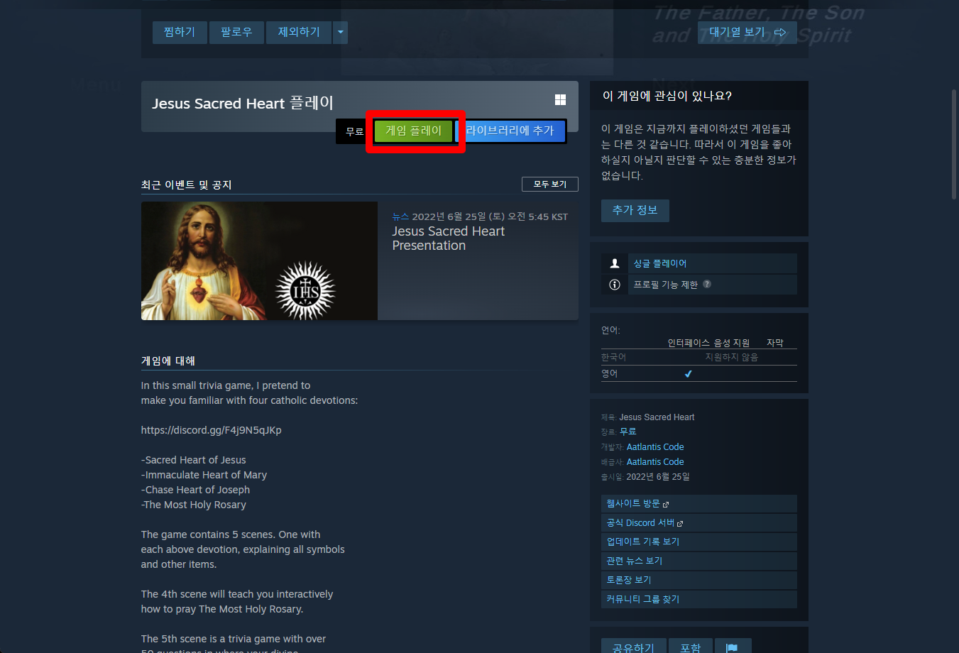 "Jesus Sacred Heart" 페이지를 내려 [게임 플레이]를 클릭하면 됩니다.