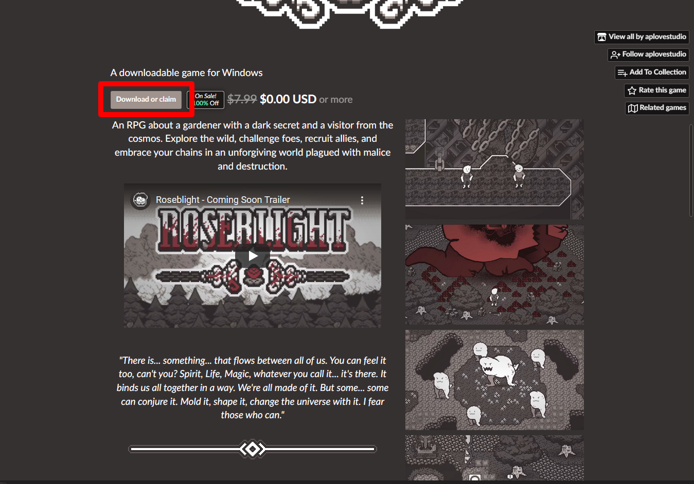 "Roseblight" 페이지를 내래서 [Download or claim]을 클릭합니다.