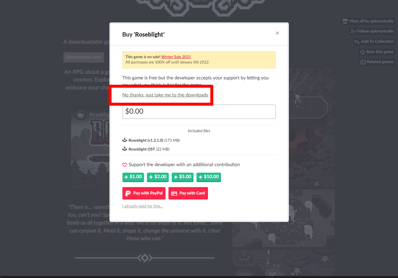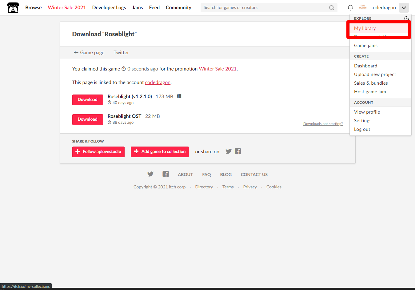 [Claim game]을 클릭하면 "Roseblight" 게임이 나의 게임 라이브러리에 추가되고 설치파일을 다운받을 수 있는 페이지로 이동됩니다.