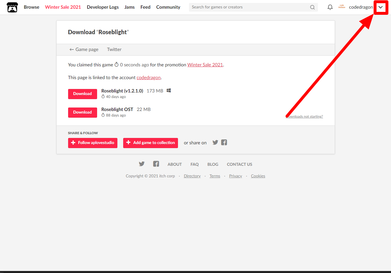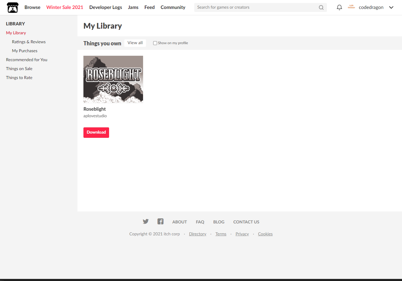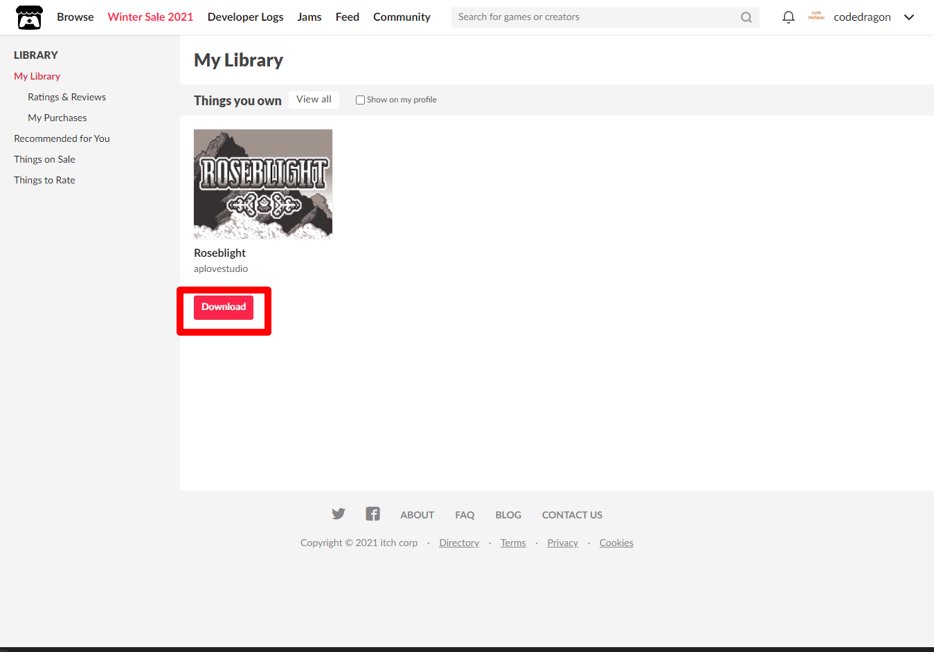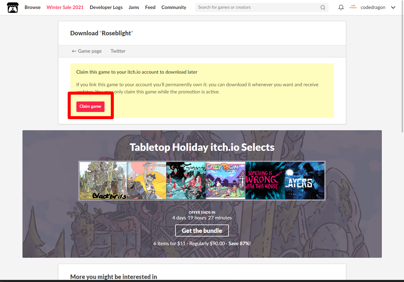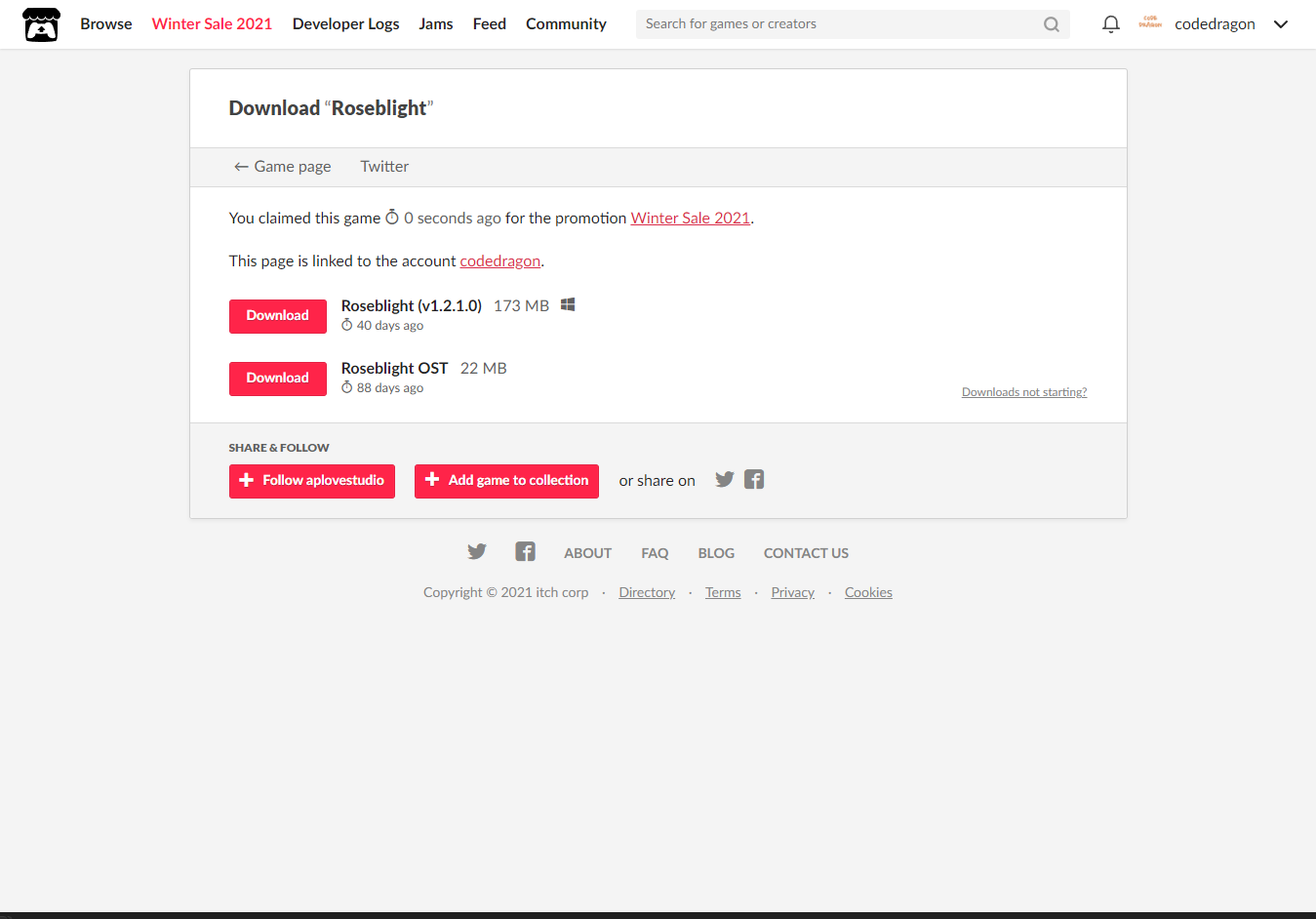 [Claim game]을 클릭하면 "Roseblight" 게임이 나의 게임 라이브러리에 추가되고 설치파일을 다운받을 수 있는 페이지로 이동됩니다.