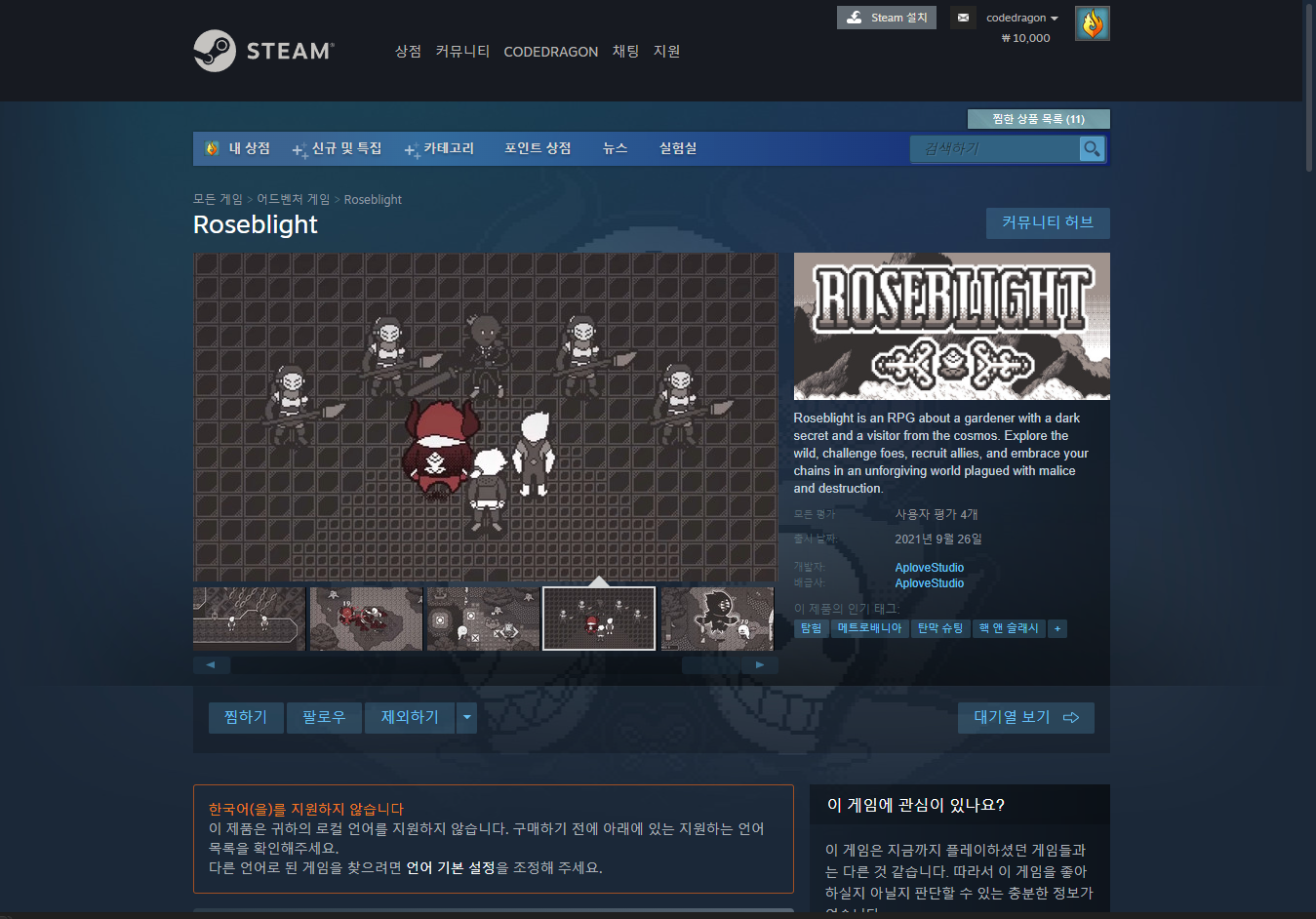 ₩11,369 -> ₩0(Free) Roseblight 로즈블라이트 무료로 받기 영구소장 (재배포) - itch.io 잇치 닷 아이오 한시적 무료 소장하기
