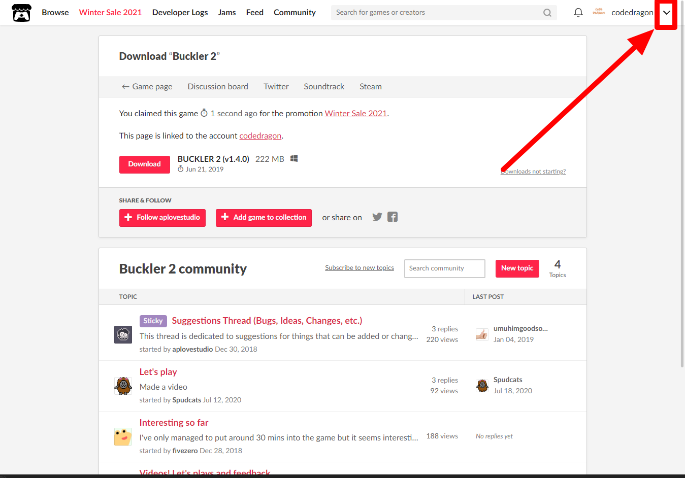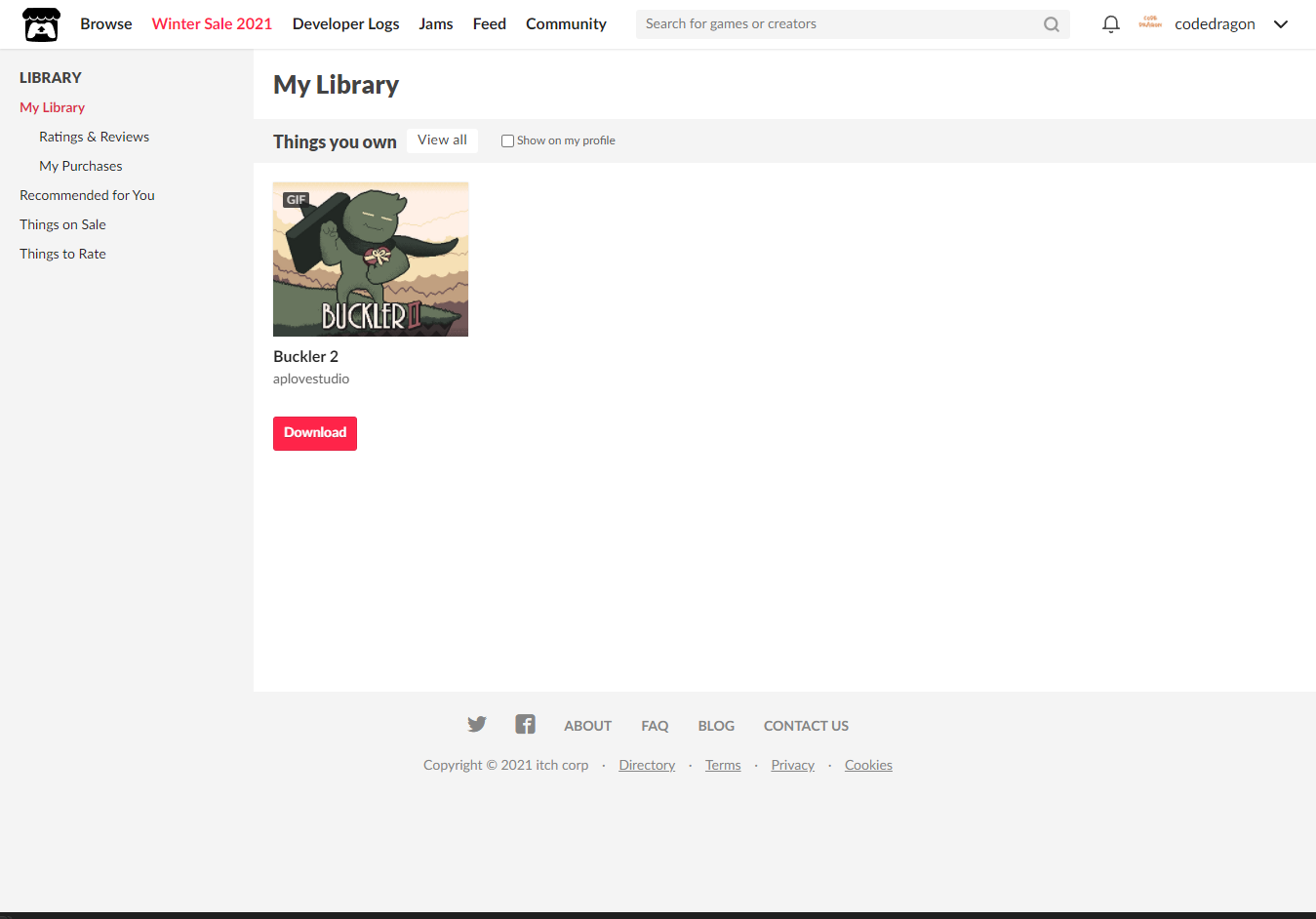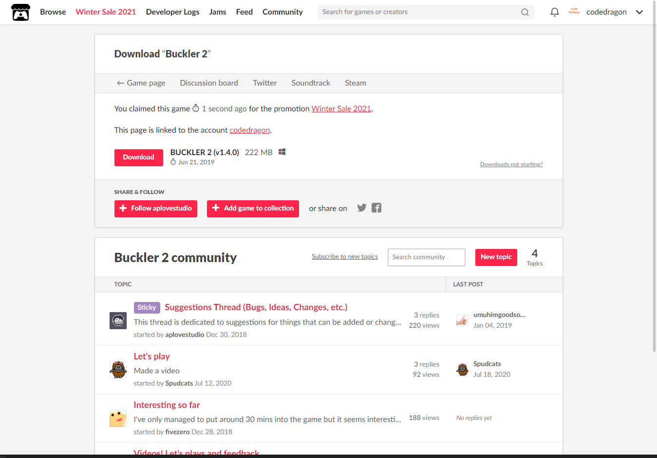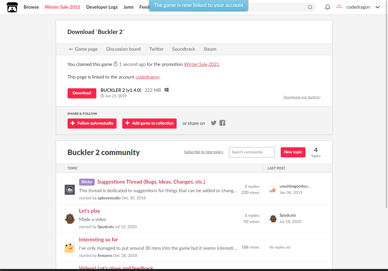 [Claim game]을 클릭하면 "Buckler 2" 게임이 나의 게임 라이브러리에 추가되고 설치파일을 다운받을 수 있는 페이지로 이동됩니다.