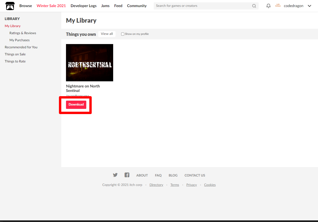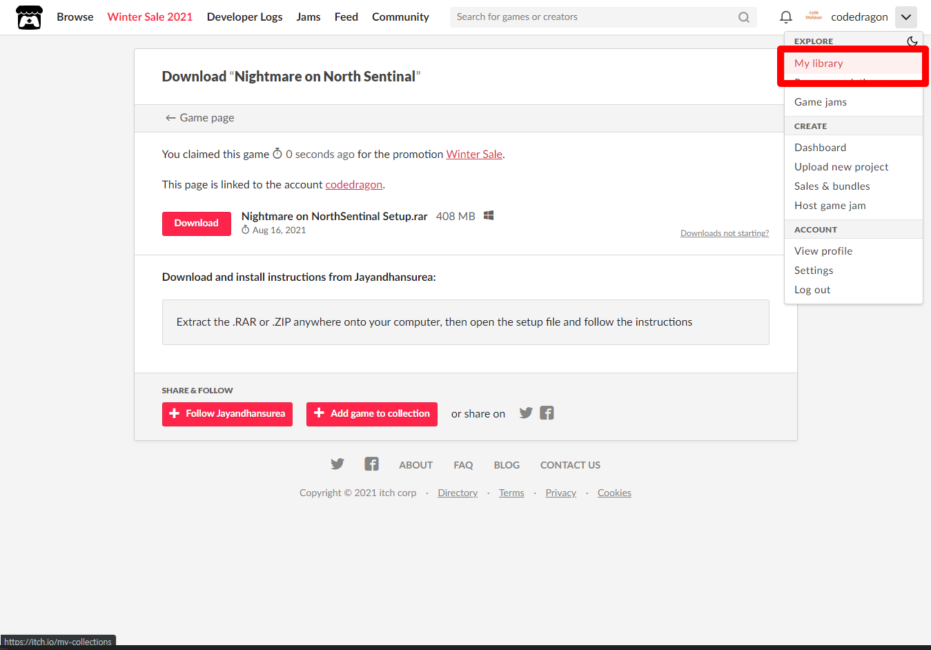 [Claim game]을 클릭하면 "Nightmare on North Sentinal" 게임이 나의 게임 라이브러리에 추가되고 설치파일을 다운받을 수 있는 페이지로 이동됩니다.