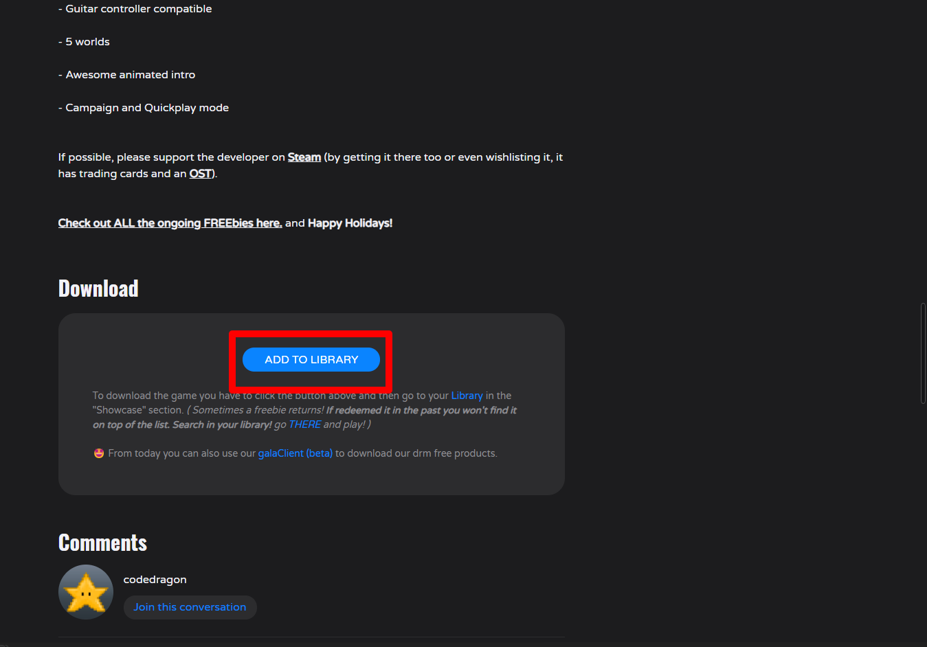"Santa Rockstar" 게임 페이지를 내려 [ADD TO LIBRARY]를 클릭합니다.