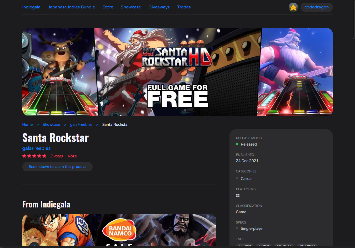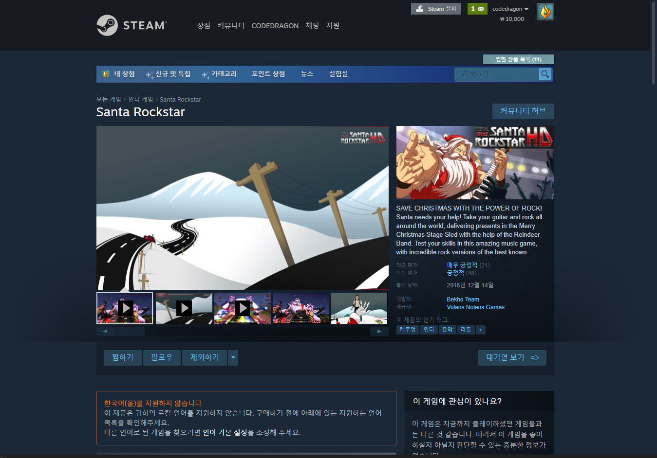 ₩7,500 -> ₩ 0(Free) Santa Rockstar 산타 록스타 무료 - 인디갈라 indiegala 무료 소장 기회 기간한정 indiegala FREE GAME, Limited time