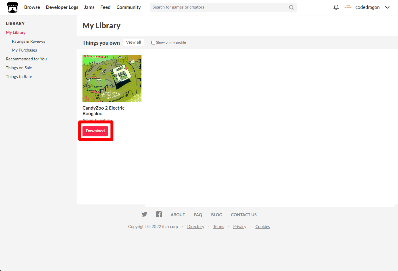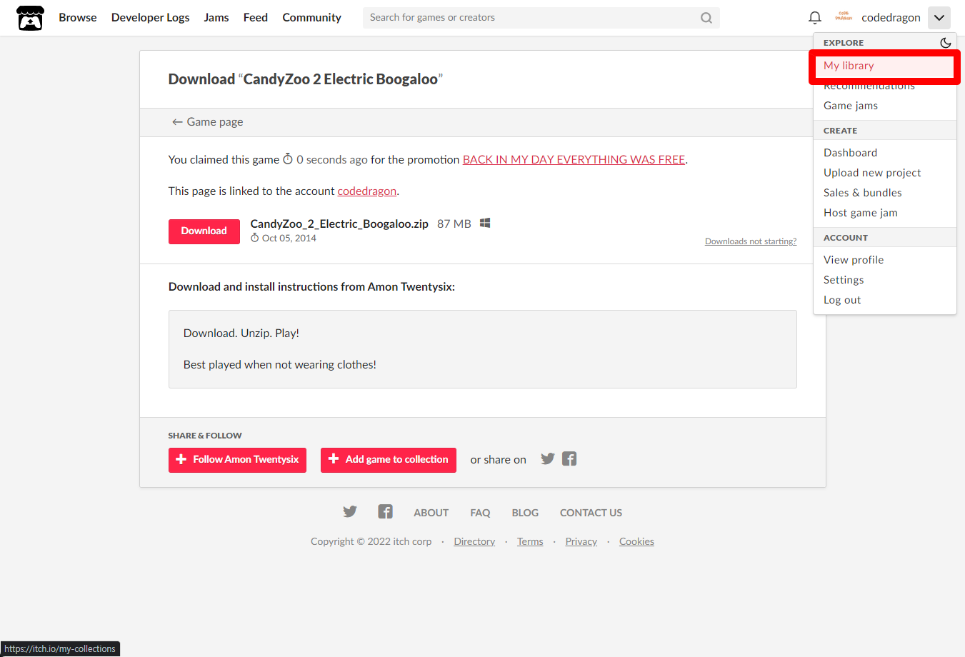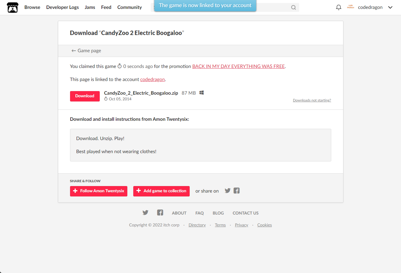 [Claim game]을 클릭하면 "CandyZoo 2 Electric Boogaloo" 게임이 나의 게임 라이브러리에 추가되고 설치파일을 다운받을 수 있는 페이지로 이동됩니다.