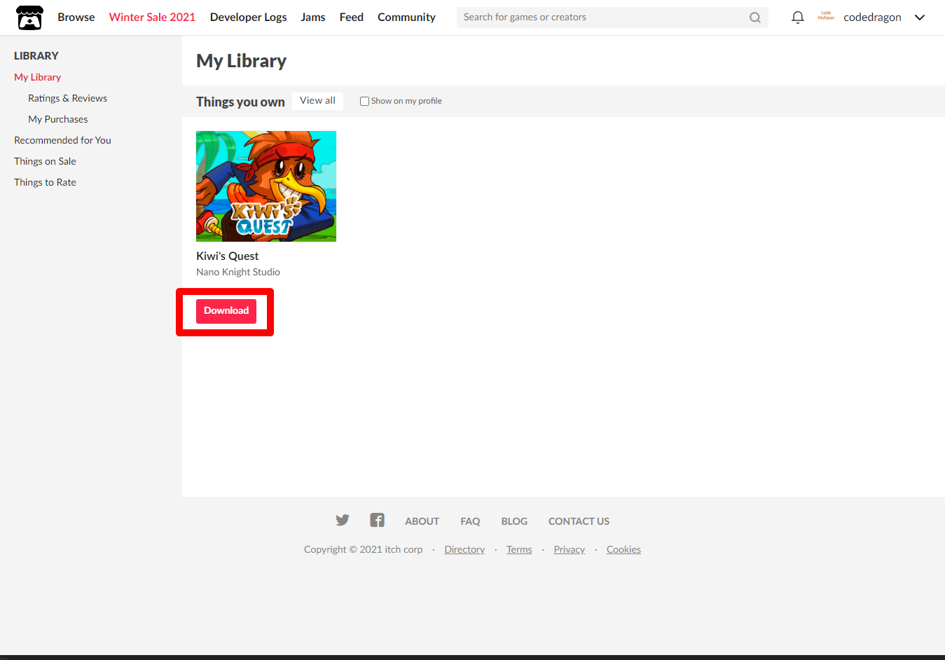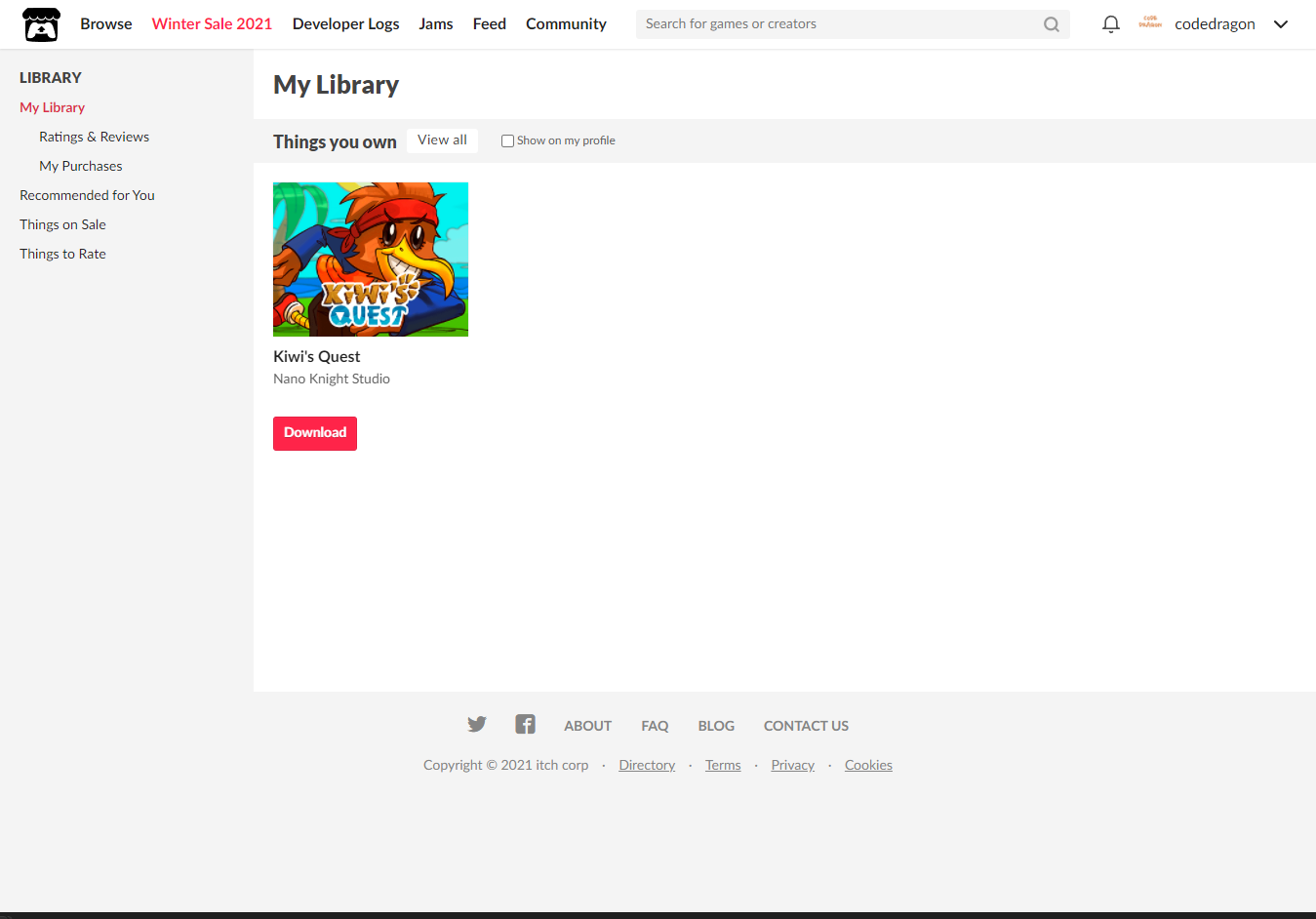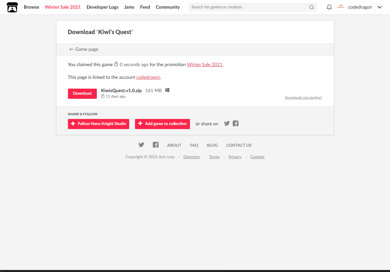 [Claim game]을 클릭하면 "Kiwi's Quest" 게임이 나의 게임 라이브러리에 추가되고 설치파일을 다운받을 수 있는 페이지로 이동됩니다.