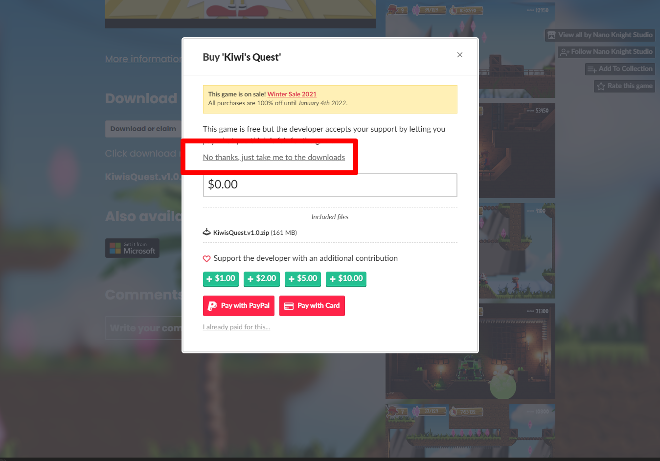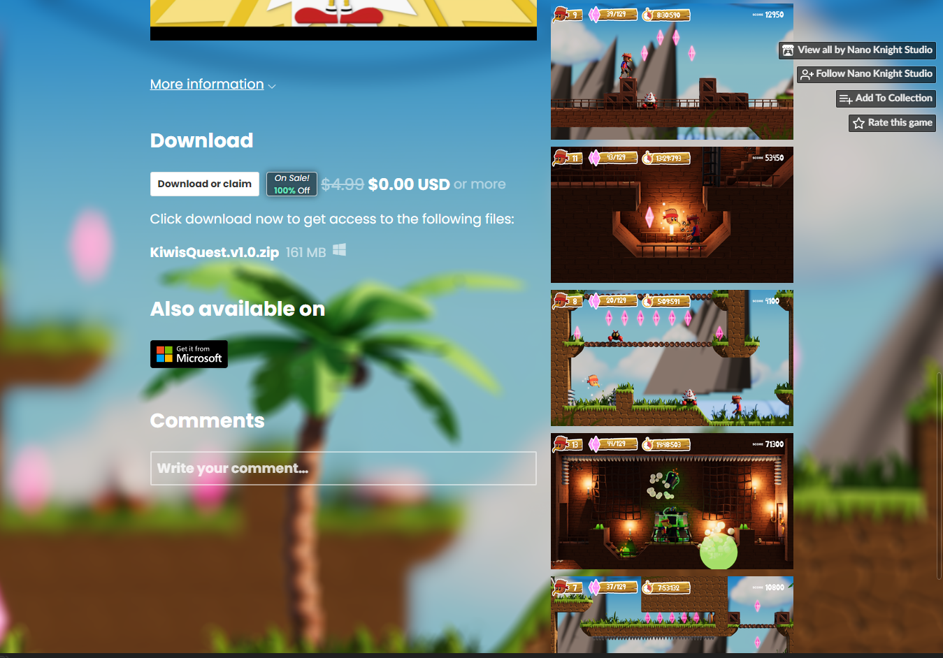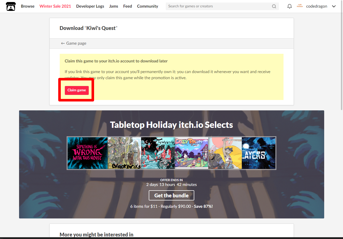 "Kiwi's Quest" 페이지를 내래서 [Download or claim]을 클릭합니다.