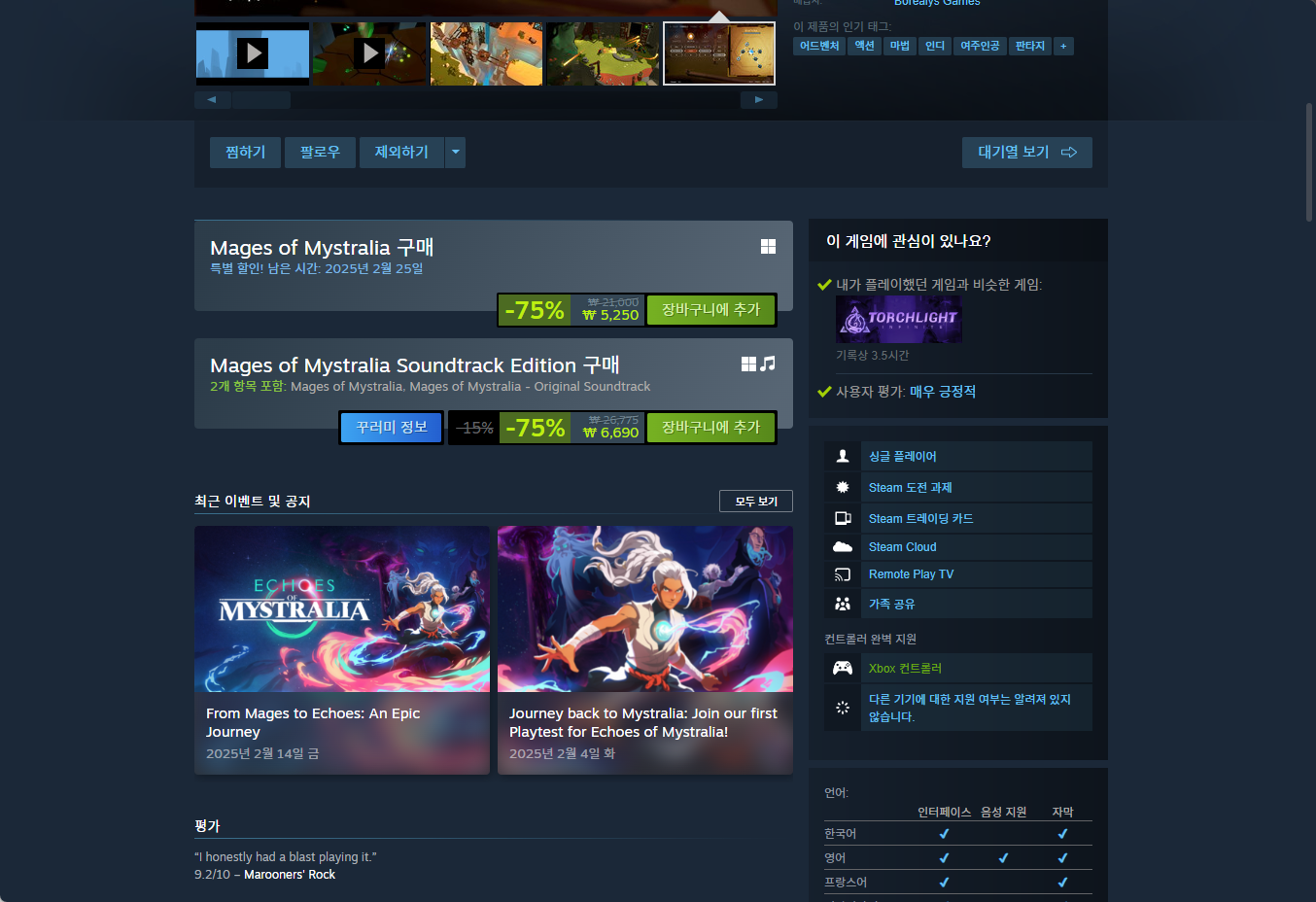 - "Mages of Mystralia 메이지스 오브 미스트랄리아" - Steam 스팀 게임 페이지