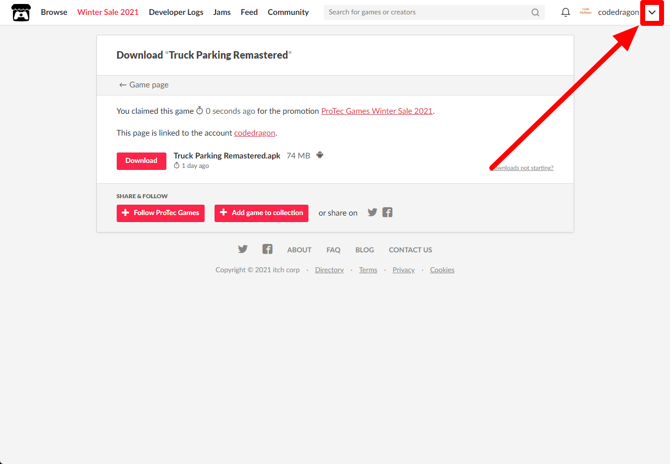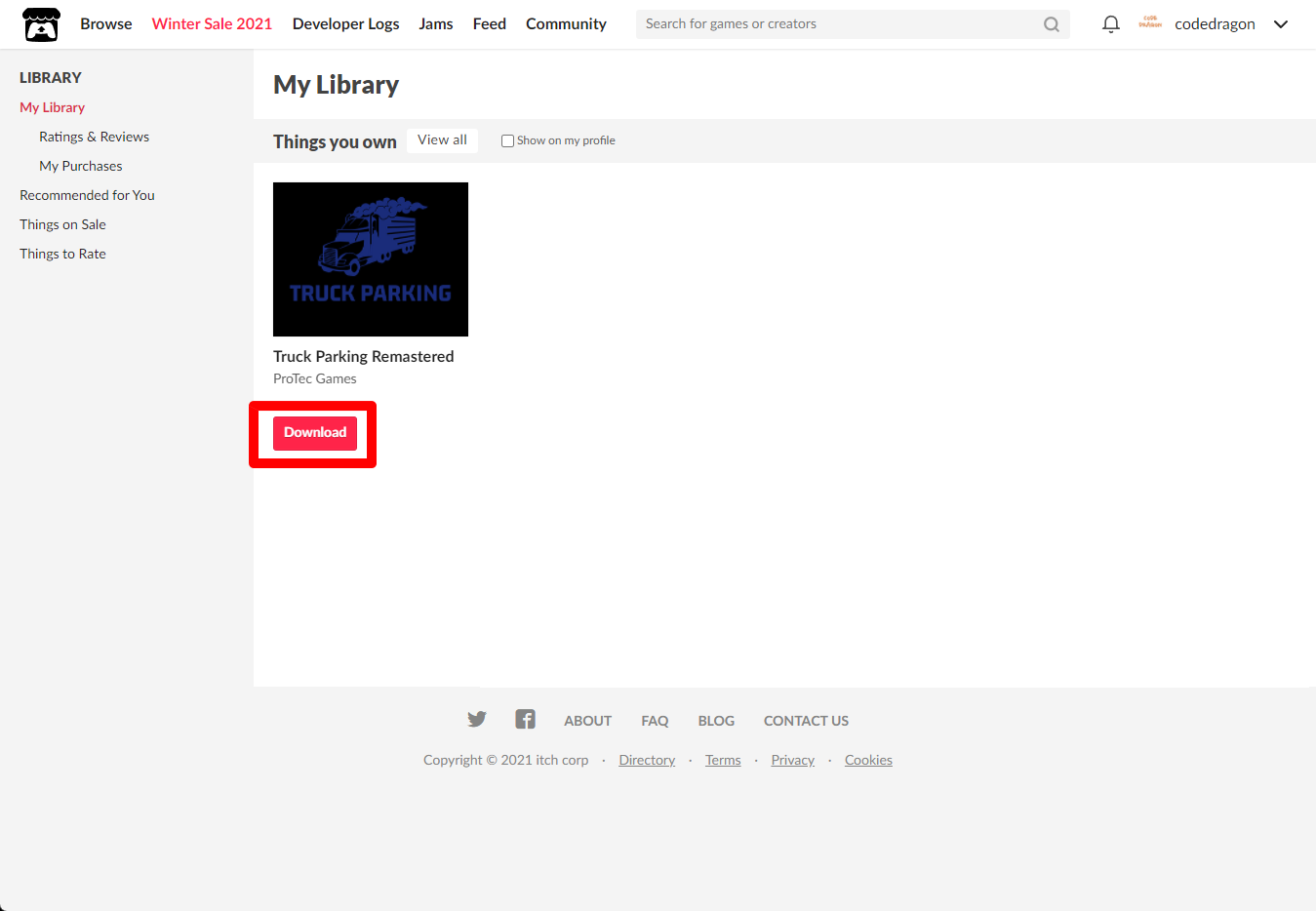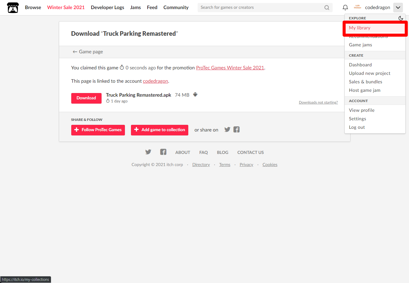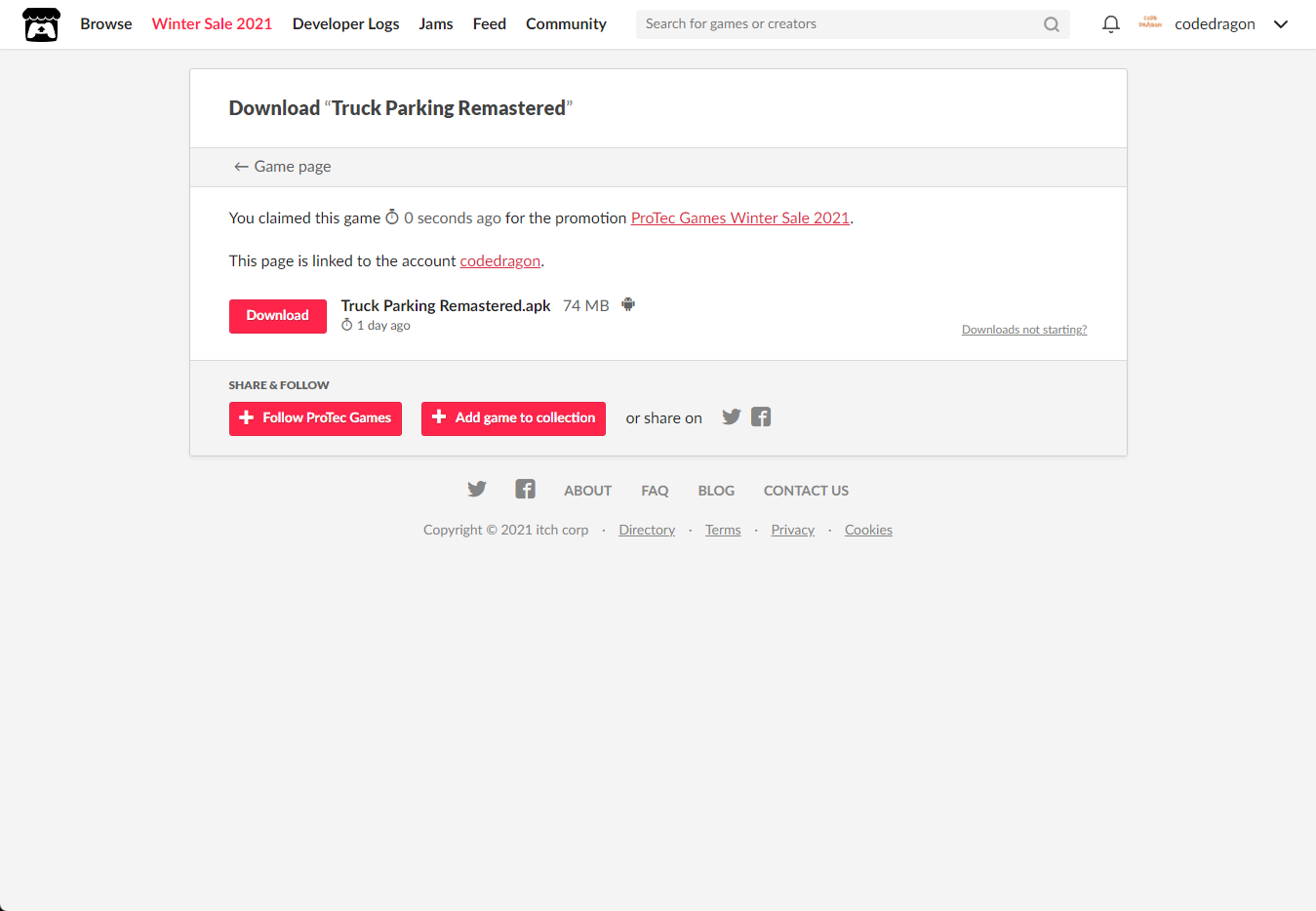 [Claim game]을 클릭하면 "Truck Parking Remastered" 게임이 나의 게임 라이브러리에 추가되고 설치파일을 다운받을 수 있는 페이지로 이동됩니다.