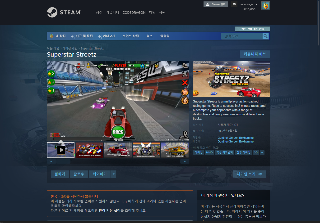 "레이싱"게임인 "Superstar Streetz"입니다.