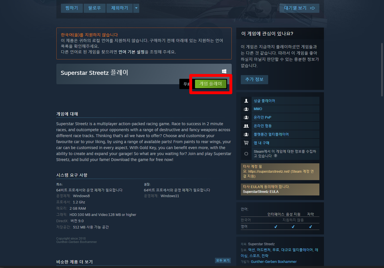 "Superstar Streetz" 페이지를 내려 [게임 플레이]를 클릭하면 됩니다.