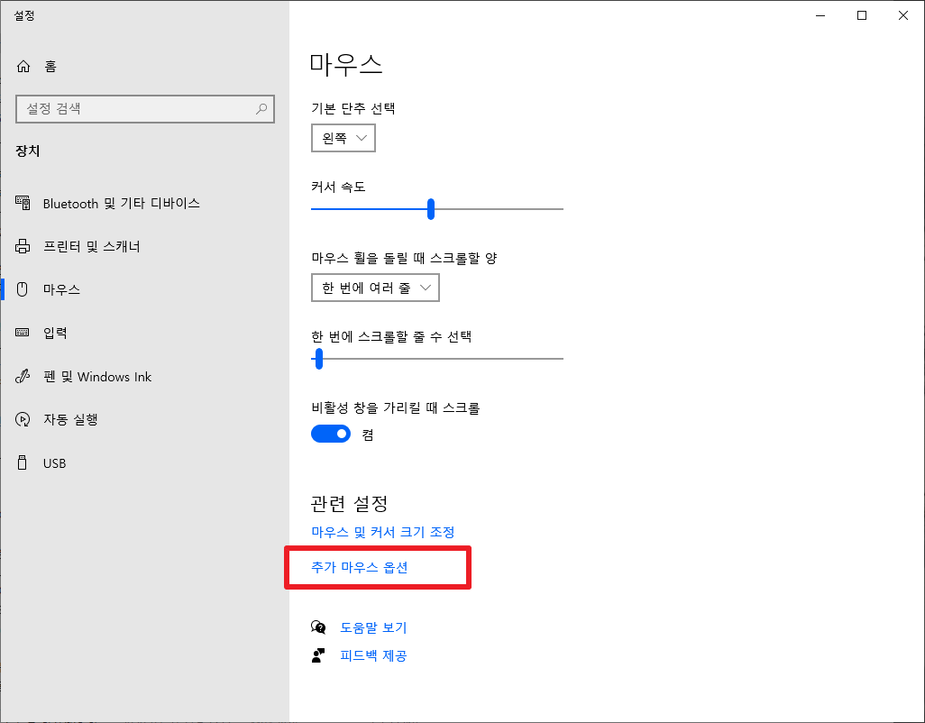 조금 밑쪽에 있는 [추가 마우스 옵션] 클릭