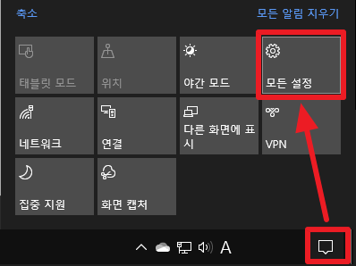 윈도우 바탕화면 우측하단의 [알림센터] >> [모든 설정]