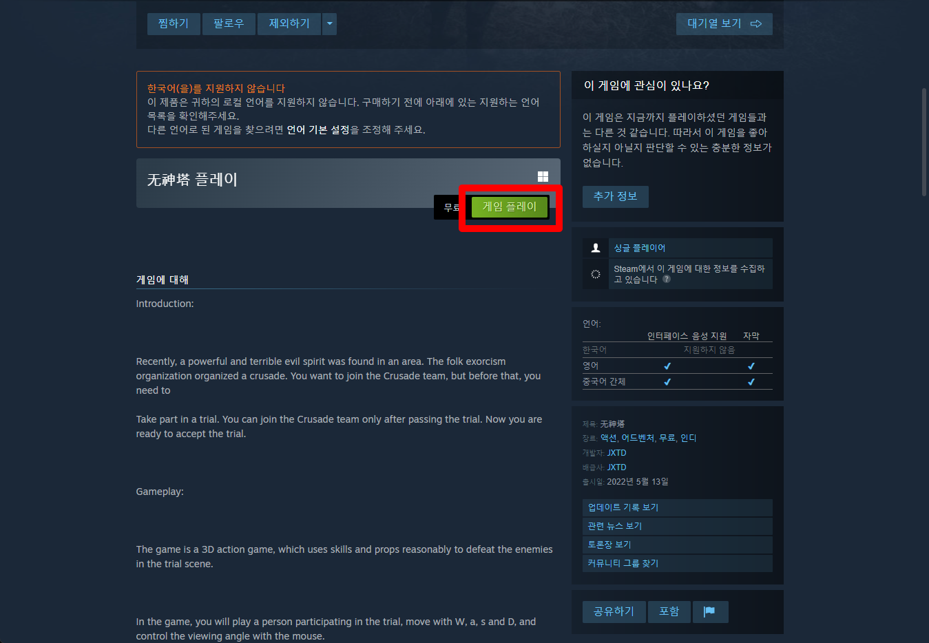 "无神塔" 페이지를 내려 [게임 플레이]를 클릭하면 됩니다.