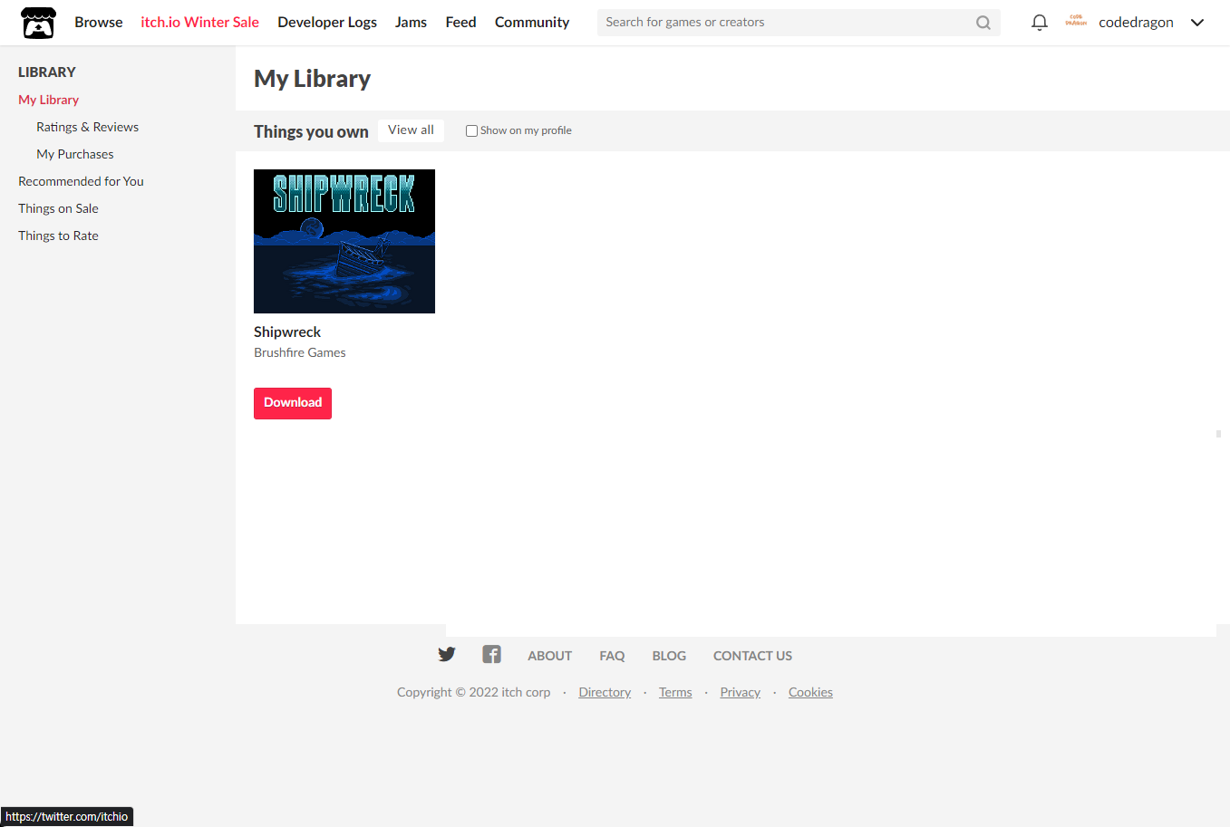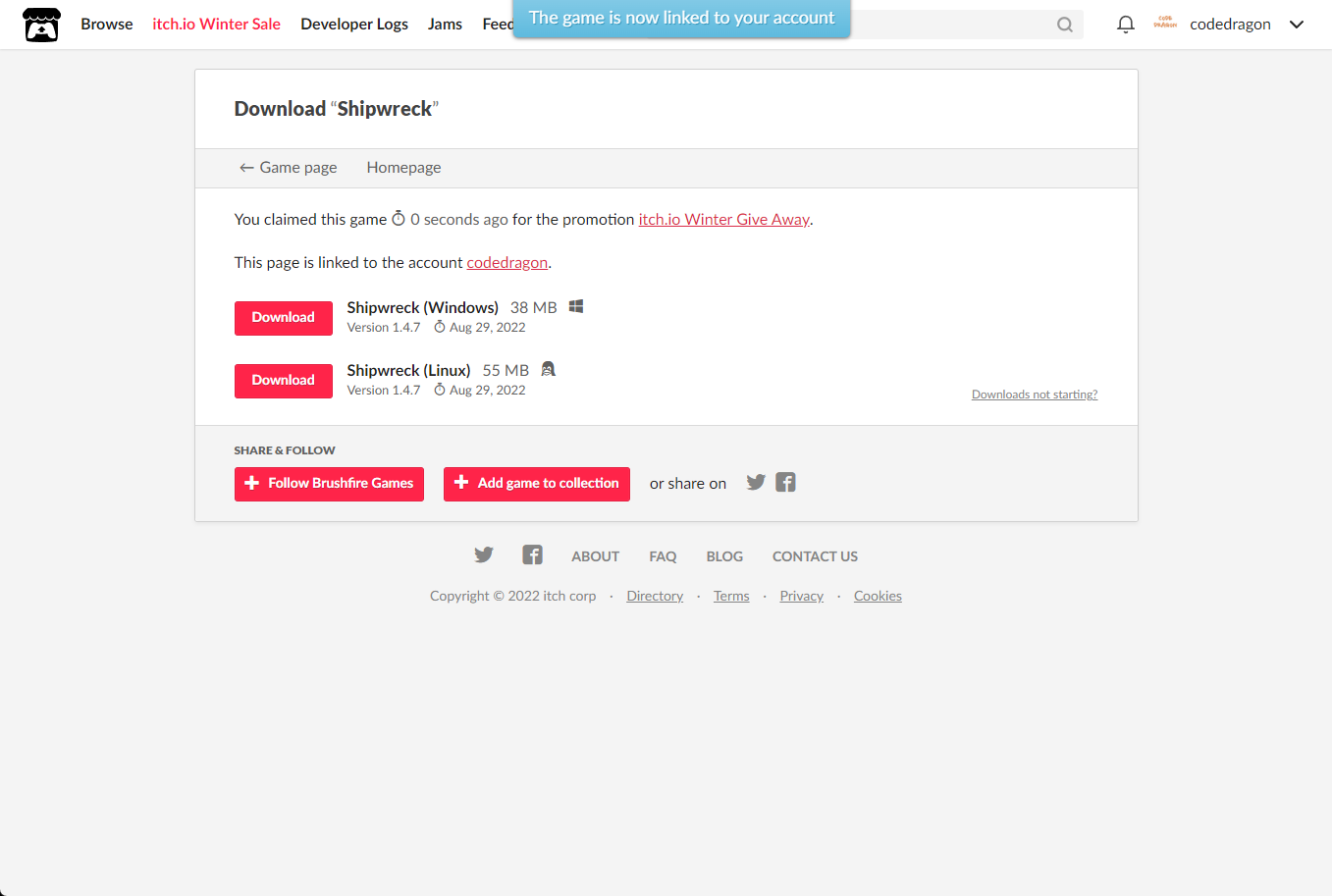 [Claim game]을 클릭하면 "Shipwreck" 게임이 나의 게임 라이브러리에 추가되고 설치파일을 다운받을 수 있는 페이지로 이동됩니다.