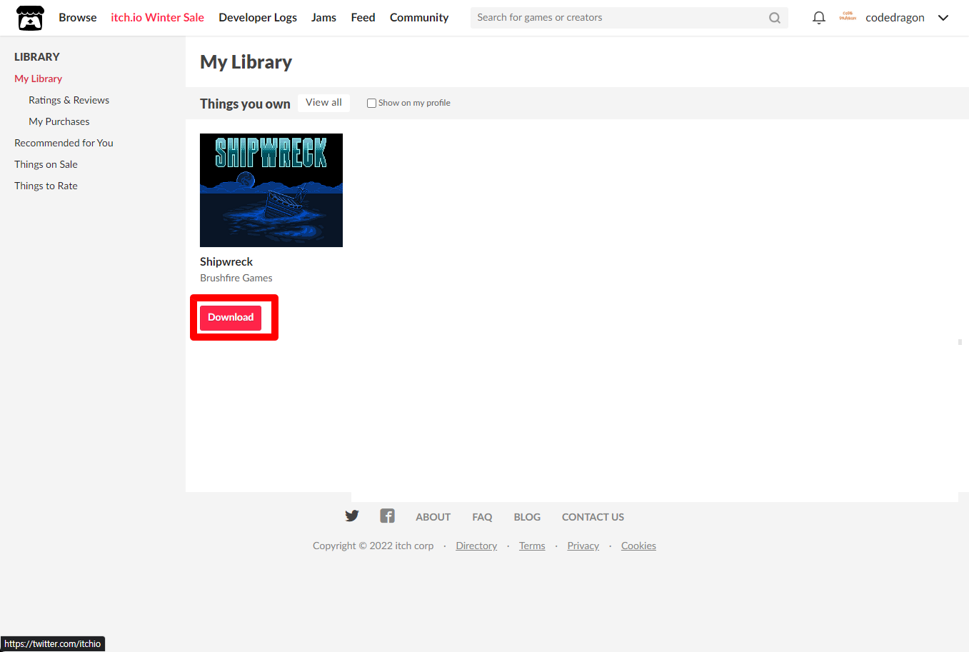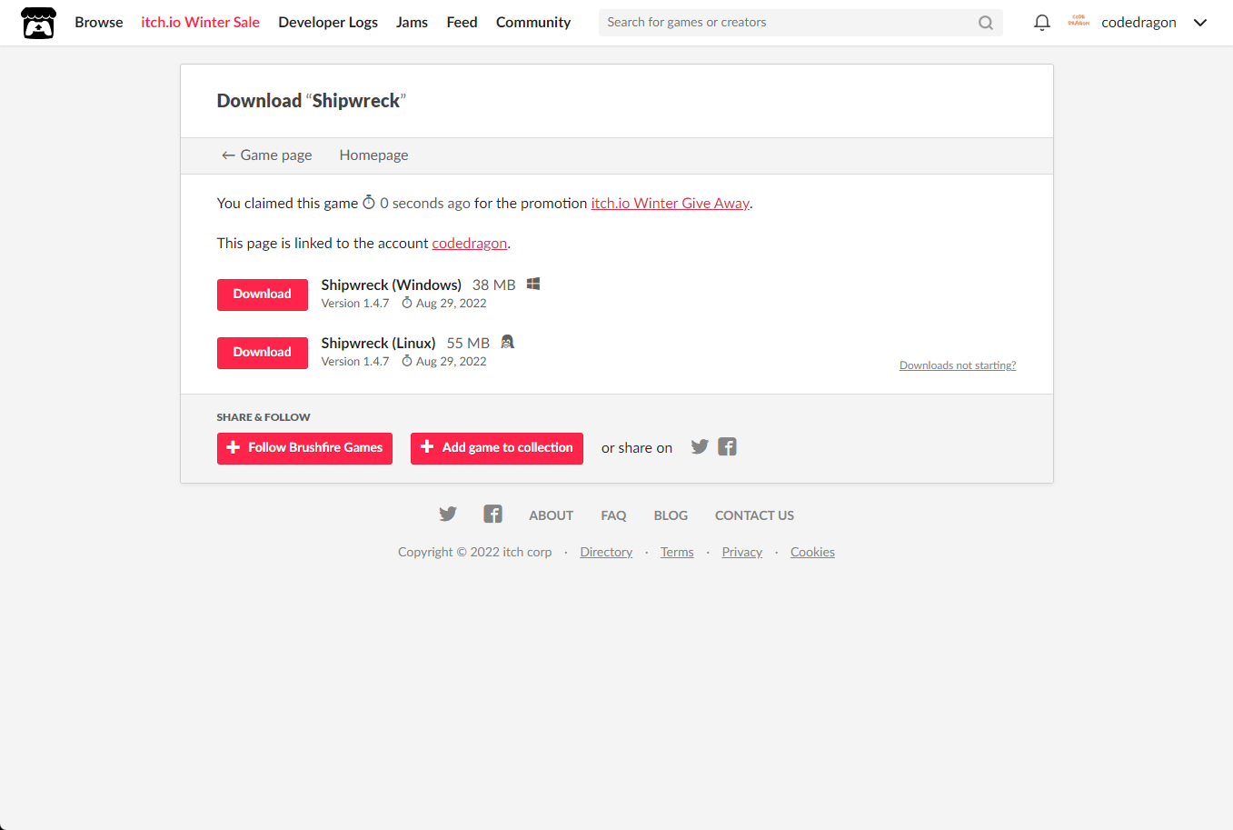 [Claim game]을 클릭하면 "Shipwreck" 게임이 나의 게임 라이브러리에 추가되고 설치파일을 다운받을 수 있는 페이지로 이동됩니다.