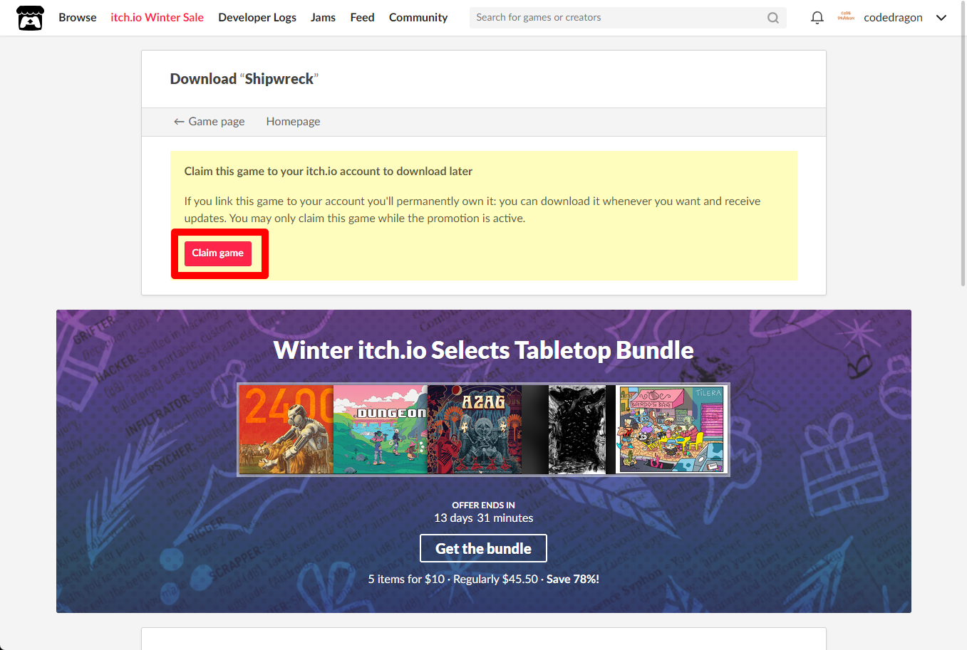 "Shipwreck" 페이지에 있는 [Download or claim]을 클릭합니다.